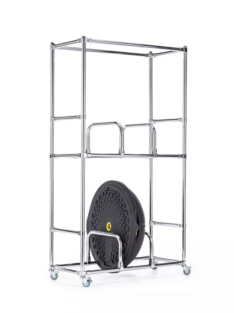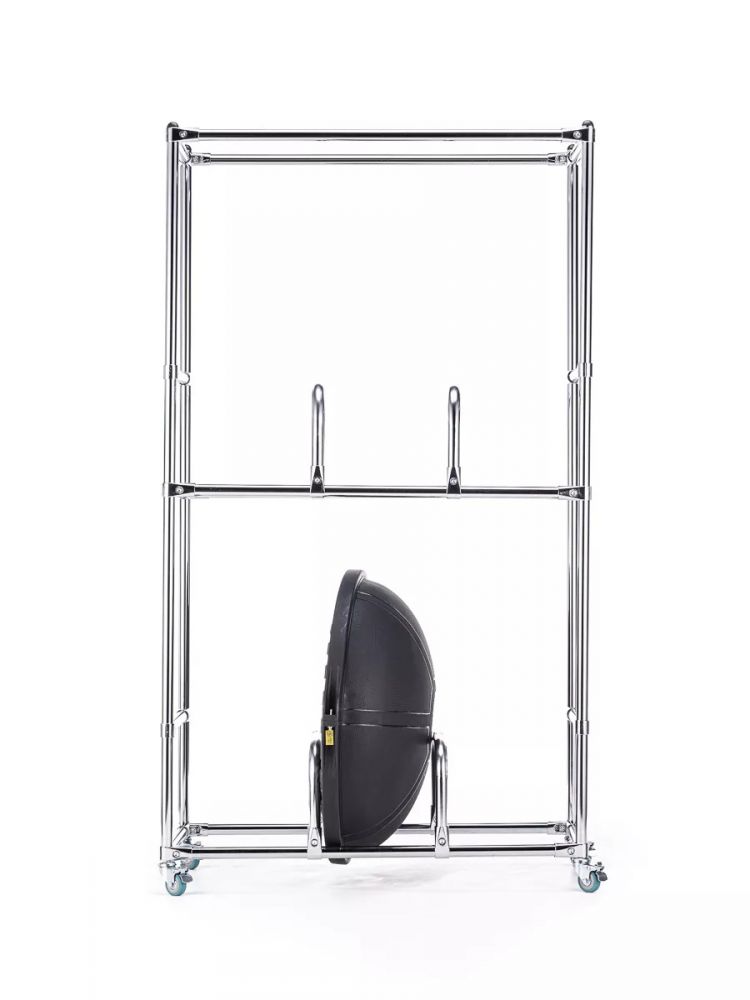 Достаточно компактная (всего 80х85 см) комбинированная стойка для компактного размещения большого количества инвентаря - гимнастических мячей (до 5 штук), медицинболов (до 4 шт), балансировочных платформ (2 шт), гимнастических ковриков (до 4 шт), гантелей (4 пары), бодибаров (до 6 шт), эспандеров и прочего. Сделана из хромированной стали. Колесики с тормозом позволяют легко перемещать стойку в необходимое место и фиксировать в нужном положении. Очень удобна для небольших залов, когда требуется на минимальной площади разместить все необходимое. Высота 1,85 м, чтобы можно было занести в стандартный дверной проем. В комплекте 3 крюка, при необходимости остальные можно приобрести отдельно.