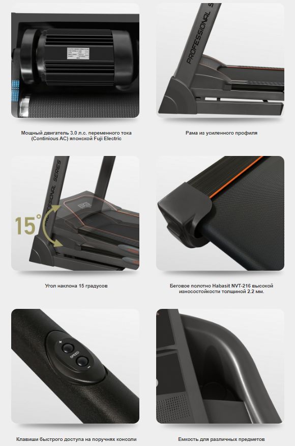 Двигатель переменного тока (AC) мощностью 3.0 л.с., рассчитан на эксплуатацию до 8 часов в день. Усиленная механическая часть представлена рамой с усиленным каркасом, построенном на профиле 80х40 мм с использованием стоек 120х30 мм. Дорожка достаточно тяжелая, ее нетто-вес составляет 101 кг, максимальный вес пользователя - 160 кг.