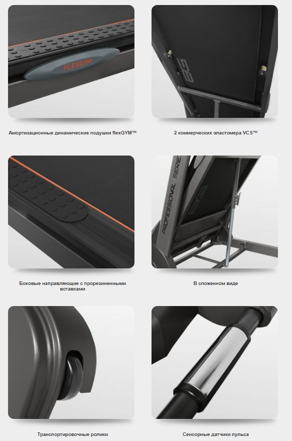 На передней части консоли расположена подставка под планшет или смартфон. К другим особенностям дорожки относятся гидравлическая система складывания, которая существенно облегчает складывание дорожки, а при раскладывании обеспечивает медленное опускание полотна в последней фазе, гарантируя легкость и безопасность. В виду того, что дорожка тяжелая, перемещение дорожки происходит не на двух, как обычно, роликах, а на четырех - при этом тренажер не нужно наклонять.