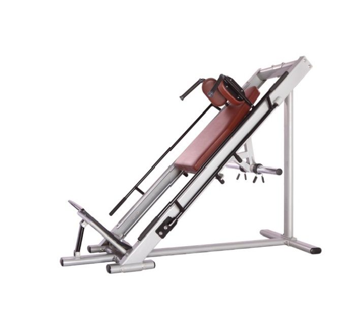 Гак-машина с профилем основной станины 60*120*2,5 мм для полноценного коммерческого использования. Угловая машина для приседания предназначена для изолированного развития квадрицепса и мышц голени.