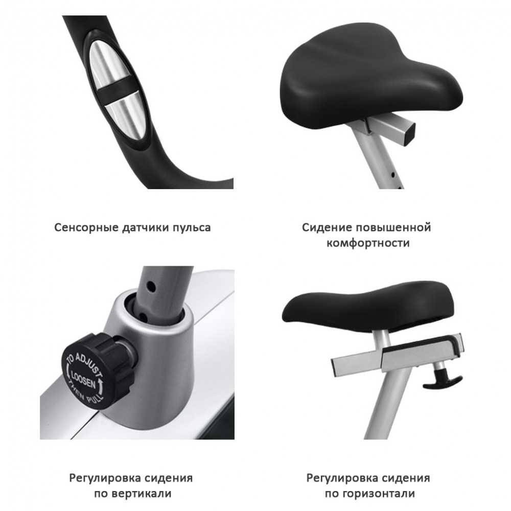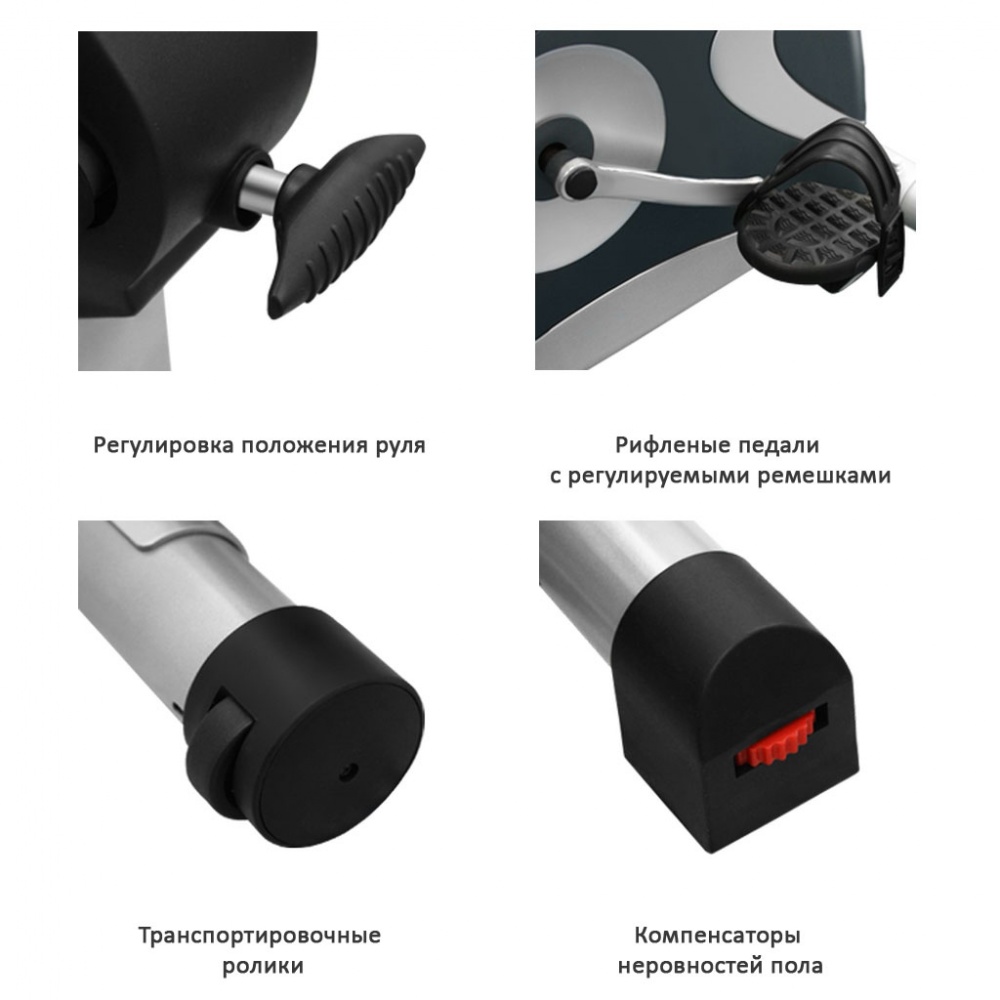 Рулевые рычаги и мягкое эргономичное сиденье регулируются на ваше усмотрение (горизонтально и вертикально). Педали тренажера с рифленой поверхностью и регулируемыми ремешками безопасности, для надежной фиксации стопы. Рукоятки обтянуты нескользящим покрытием для лучшего сцепления с поверхностью. Компенсаторы неровностей устраняют вибрацию и создают более устойчивое положение тренажера во время занятий. Следующая комфортная составляющая, это полный контроль над тренировкой. Датчики пульса на рулевых рычагах помогут определить частоту сердцебиения.