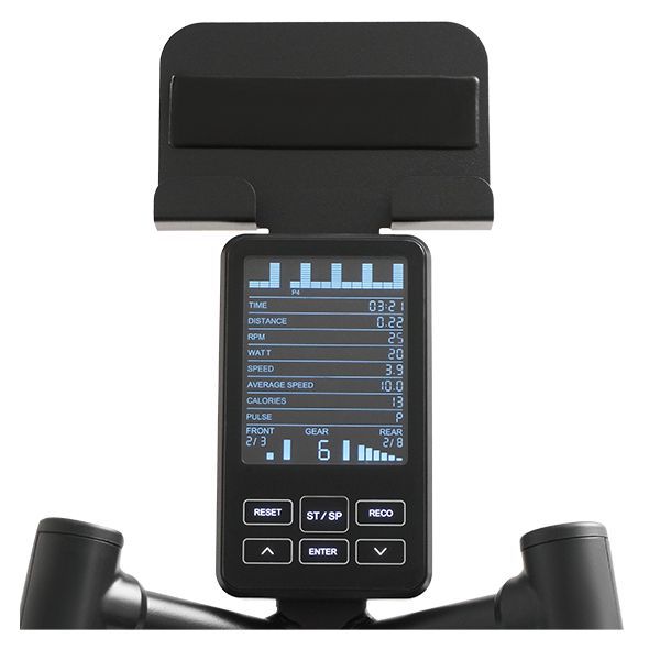 Информативный ЖК-дисплей предоставляет информацию о параметрах тренировки. Отображаемые параметры: Скорость, Дистанция, Время, Расчет потраченных калорий, Информацию о пульсе (ЧСС), Нагрузка в Вт.