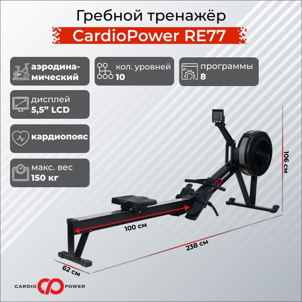 Гребной тренажёр CardioPower RE77 обновленная и доработанная версия ранее популярной одноименной модели, имеет эргономичную конструкцию, оснащен аэродинамической системой сопротивления, усиленной рамой и возможностью компактного складывания. Предназначен как для комфортных, так и для высокоинтенсивных HIIT тренировок.