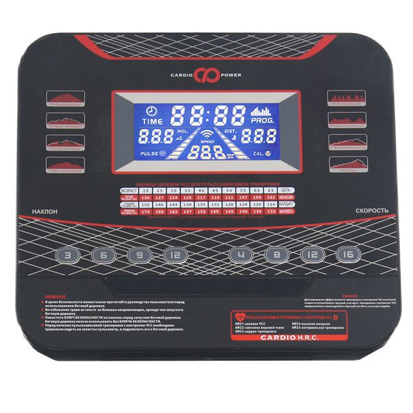 Усиленная конструкция рамы, беговой деки и приводных элементов обеспечивают высокую надежность тренажера. LCD дисплей профессионального уровня отображает все данные тренировки. Контроль пульса осуществляется с помощью контактных сенсоров и беспроводного считывания пульса с кардиопояса. Продуманный функционал для комфортных тренировок. Удобная консоль с клавишами быстрого управления и широким 7-ми дюймовым LCD дисплеем с мягкой голубой подсветкой предоставляет полную информацию о текущих показателях тренировки: скорость, время, расстояние, калории, угол наклона, частота пульса, выбранная программа; Целевые программы для максимальной мотивации и результативности тренировок; HR Программы - Пульсозависимые программы, изменяют нагрузку для поддержания заданного целевого уровня пульса; Клавиши быстрого выбора Скорости 4-8-12-16 и Угла наклона 3-6-9-12; Возможность подключения любимой музыки по Bluetooth; Bluetooth для подключения внешних устройств для музыки и вертуального ланшафта таких как kinomap и zwift; Держатель для планшета, зарядка USB и держатель для бутылки для создания комфортных условий во время тренировки;