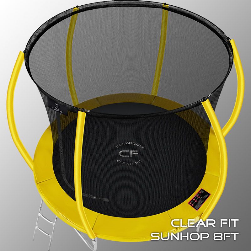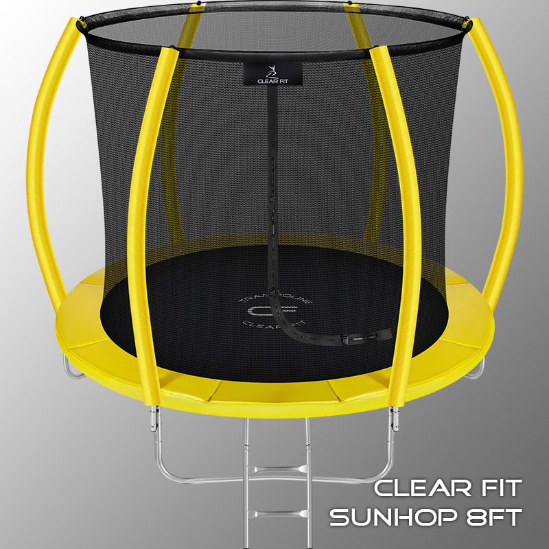 Современные батуты Clear Fit серии SunHop — отличаются комфортом и надежностью. Надежная рама из качественных комплектующих, прочная защитная сеть снабжена прямым креплением к прыжковому полотну и дополнительной защитой входа, наверху каркасное жесткое крепления, сеть не провисает и не слетает во время тренировок. Увлекательный, полезный и безопасный тренажер для всей семьи. Батуты серии SunHop поставляются в оптимальной для комфорта и безопасности комплектации: батут, верхняя защитная сеть, защитный мат и лестница. Размер батута 8 футов с прыжковой поверхностью 2.015 м легко разместить на любом участке, он подойдет и для детских игр, и для тренировок. Верхняя защитная сеть оберегает от падений, усиленная молния и дополнительная защита входа уберегут малышей от случайного входа или падения. Надежный каркас из гальванизированной стали, качественные комплектующие и погодостойкие метизы рамы делают батут безопасным, устойчивым, надежным, гарантируют полную защиту от коррозии и долгий срок службы. Максимальный вес пользователя батута SunHop 8Ft — до 120 кг.