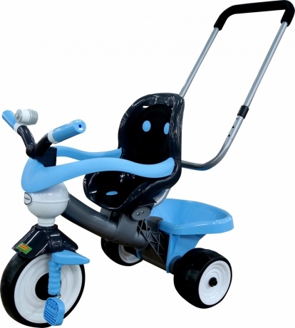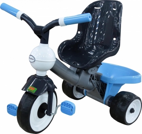 Стильный велосипед матового цвета не увешен всевозможными игрушками и мигалками, но тем не менее очень функционален. Ребенку будет интересно нажимать на клаксон, а в глубокую корзину можно положить любимые игрушки для песочницы. Маленький спортсмен сможет самостоятельно крутить педали, а когда устанет, велосипед можно катить при помощи ручки управления. Колеса широкие, сделаны из вспененного каучука. Малыш удобно расположится на мягком сиденье со спинкой, а защитный бампер не даст ему выпасть при движении.