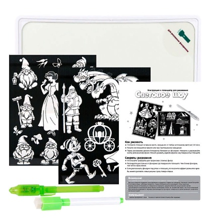Набор позволяет создать множество рисунков в темноте или при приглушенном освещении, используя луч света.