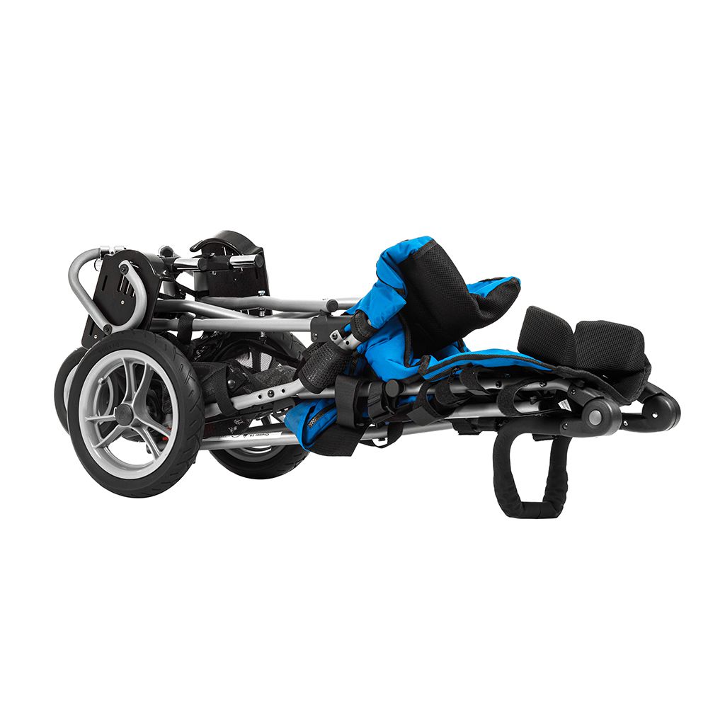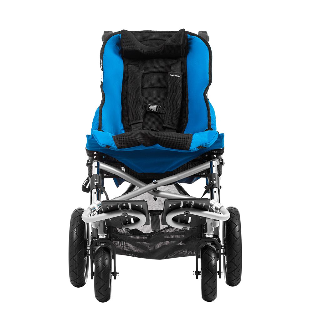 Кресло оснащено H-образными ремнями безопасности, имеющих фиксацию в нескольких точках. Подголовник является продолжением спинки и создает комфорт пользователю при длительных прогулках.