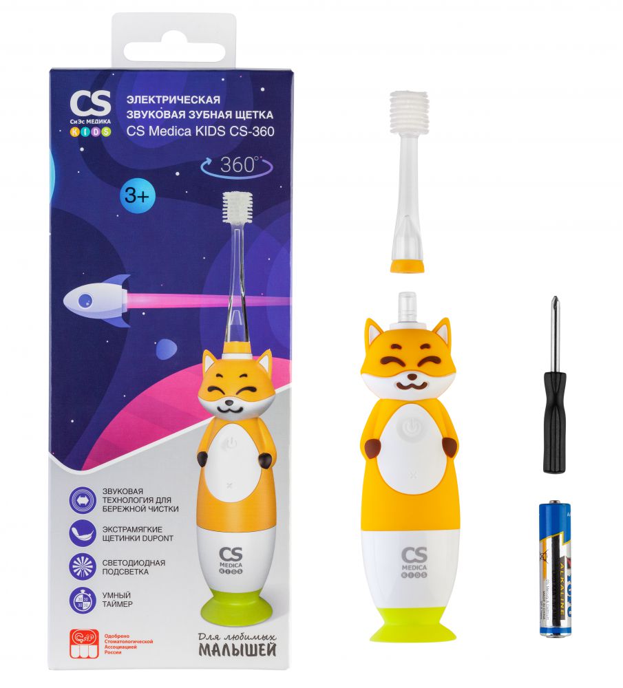 Электрическая звуковая зубная щетка CS Medica KIDS CS-360 разработана для детей от 3 лет. Привлекательный дизайн в виде лисенка и светодиодная подсветка не оставят ребенка равнодушным и превратят чистку зубов в веселую игру.