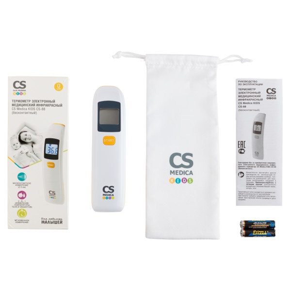 Термометр Kids CS-88 - это электронный медицинский инфракрасный(бесконтактный) прибор, предназначенный для быстрого и точного измерения температуры на лбу у детей и взрослых, а также объектов (детского питания, воды в ванночке и т. д.)