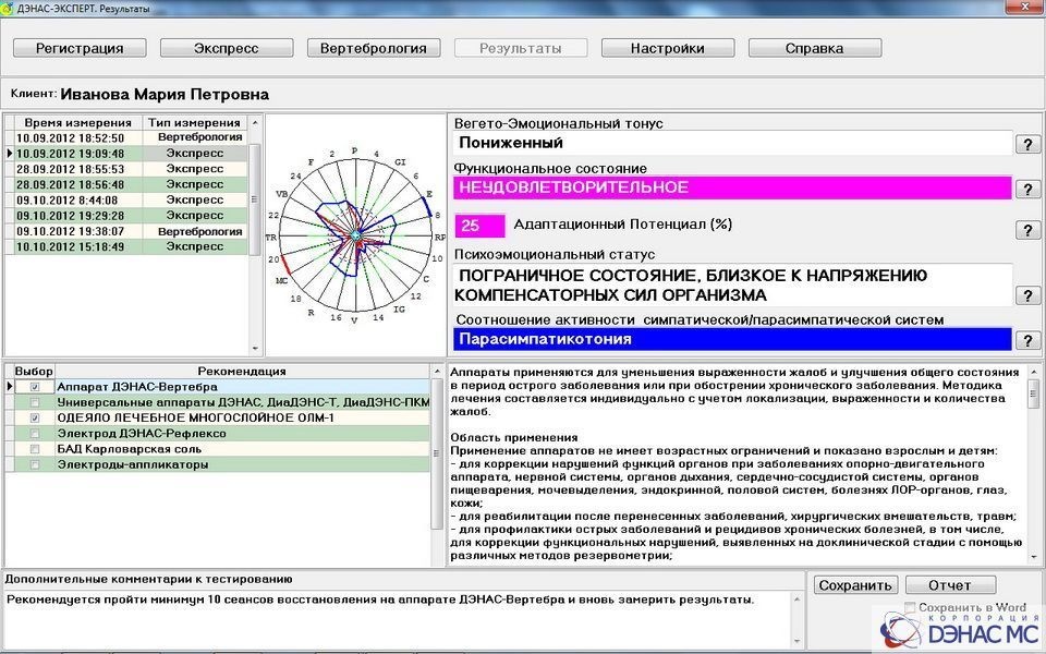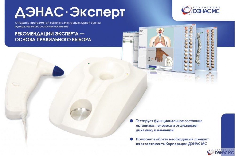 Аппаратный комплекс Дэнас Эксперт создан для определения функционального состояния организма пользователя и выявления соответствующих продуктов компании, оказывающих лечебное и профилактическое воздействие на установленные проблемные области. Оценка состояние организма клиента осуществляет электропунктурным датчиком. После диагностики программа выдает подробные рекомендации, список лечебных аппаратов Дэнас и описание их работы. Аппарат совмещается с любом компьютерным обеспечением, позволяет отследить динамические изменения, происходящие в процессе терапии.