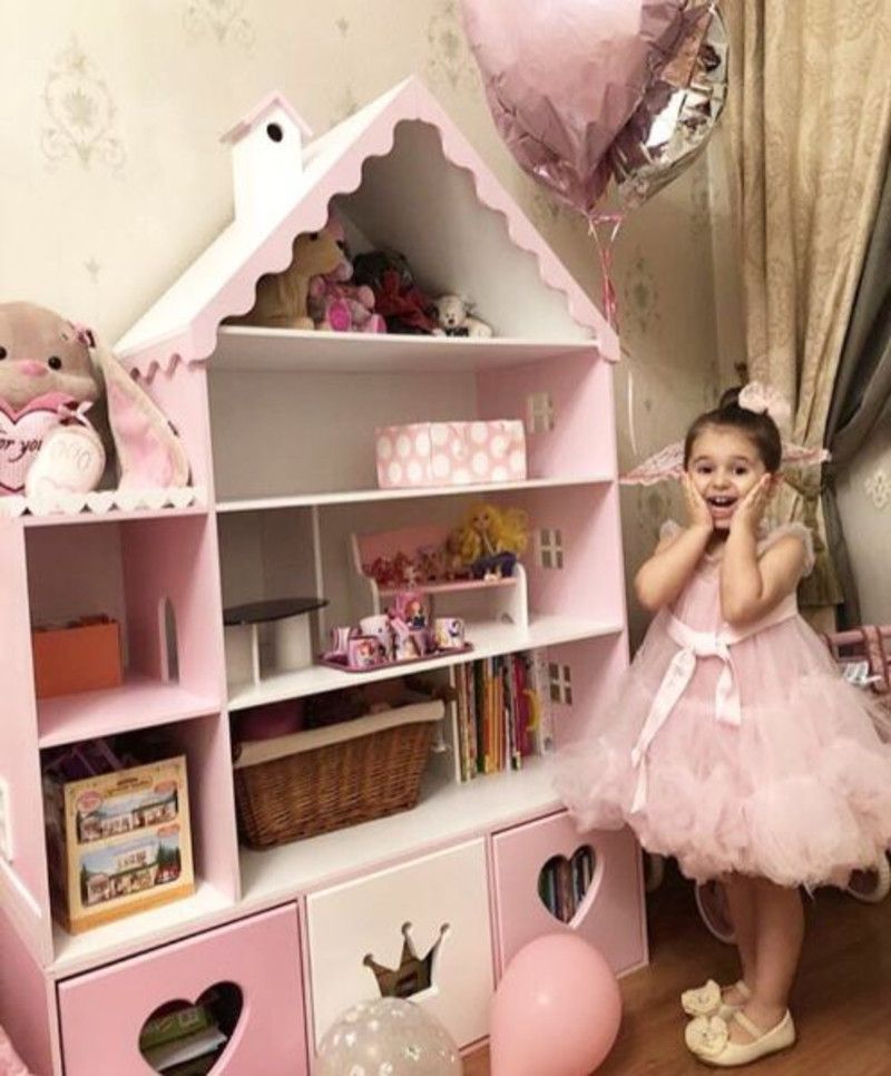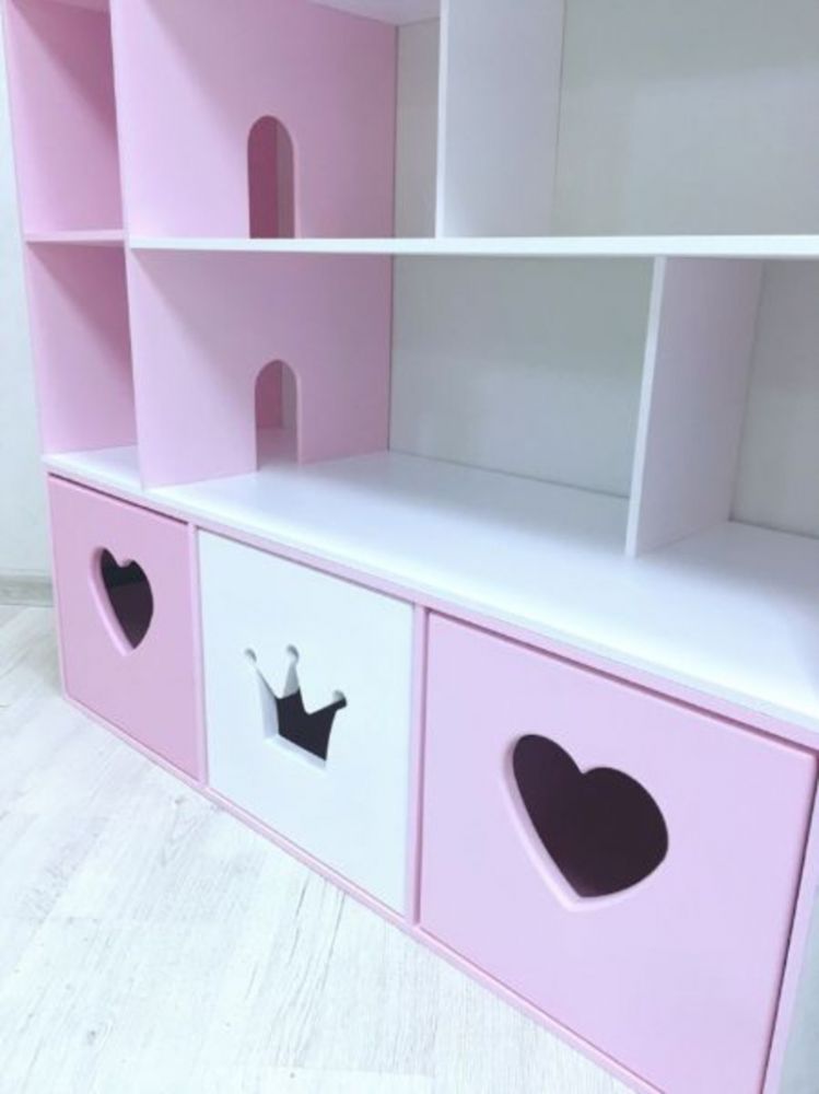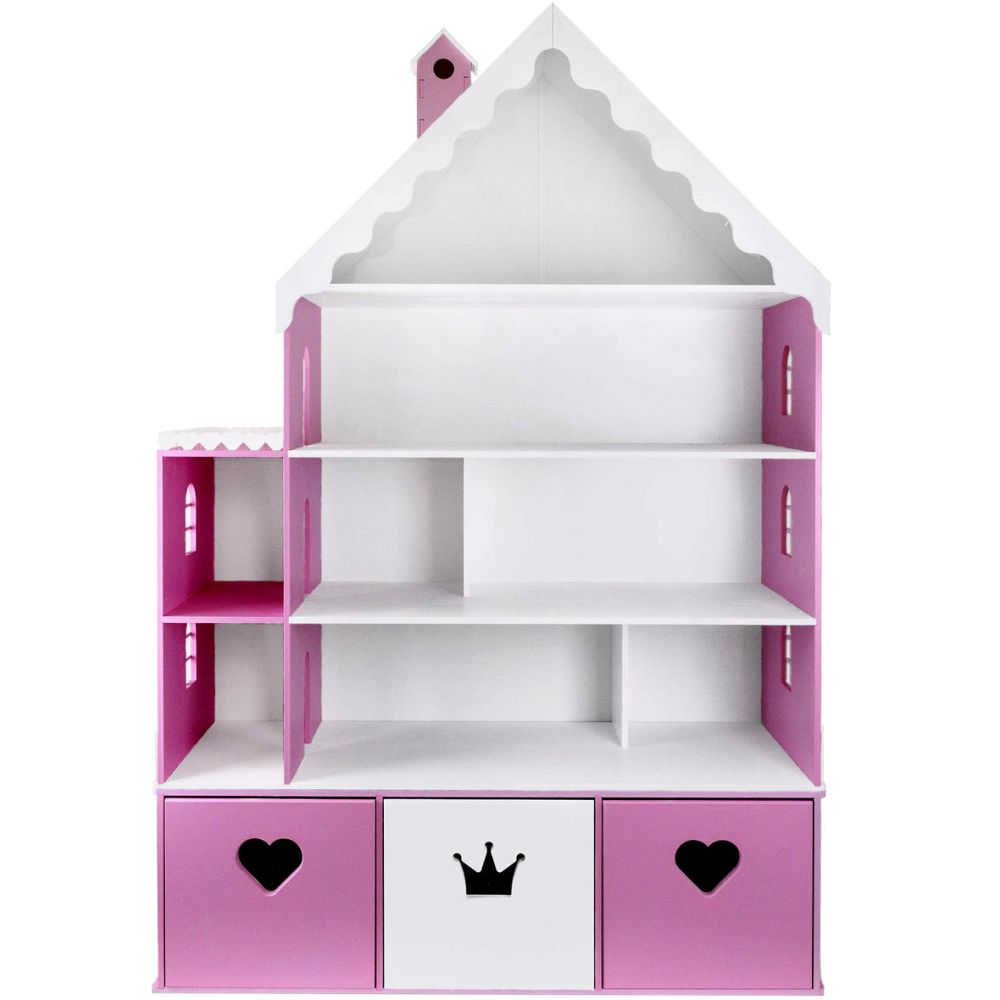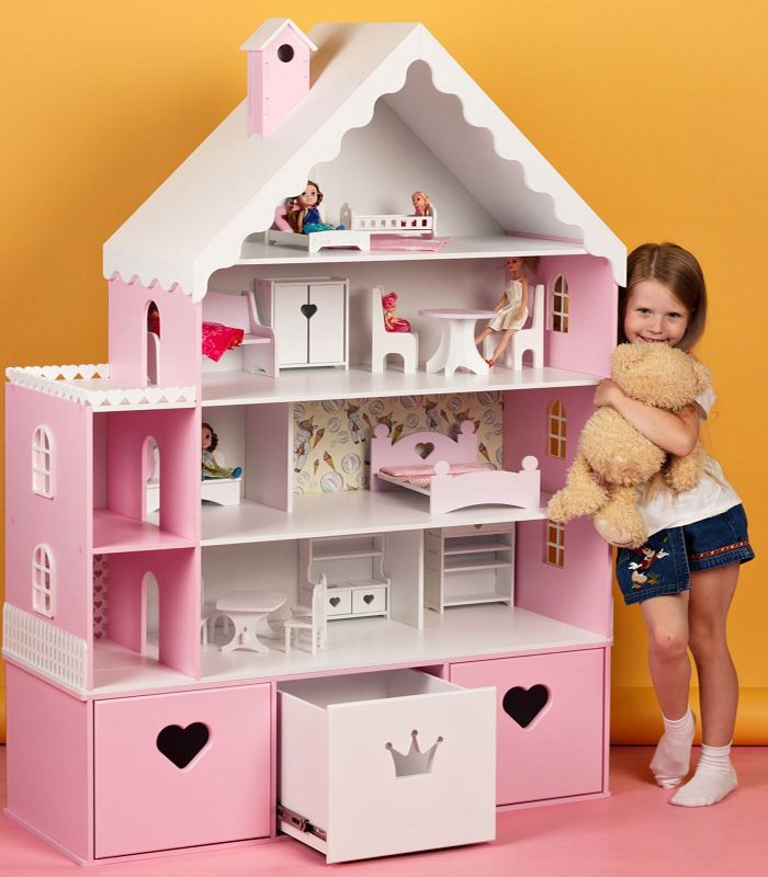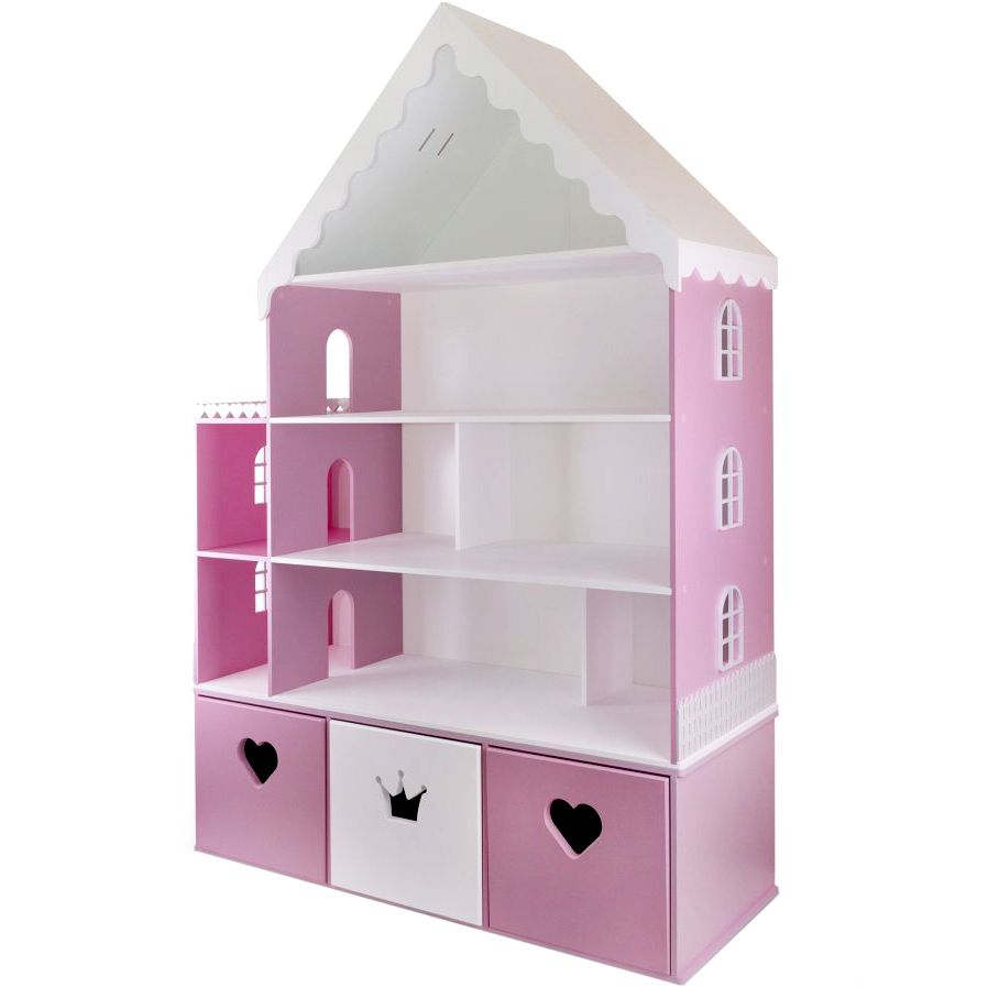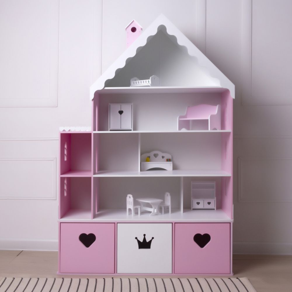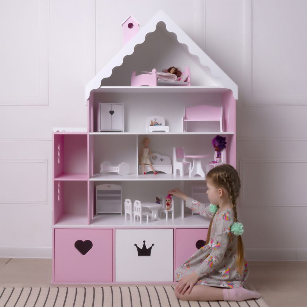 С помощью такого красивого домика каждая девочка создаст свою кукольную сказку, а ящики для хранения игрушек помогут в поддержании порядка в комнате. Ну а после того, как ребенок вырастет, полки домика наполнят книжки и учебники.