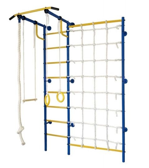 Комментарий: по причине наличия в квартире натяжных потолков, выбирали себе такую шведскую стенку, чтобы крепилась на стену. Этот вариант понравился ещё и тем, что веревочная и металлические лестницы расположены на одной плоскости, поэтому ребёнок без проблем перелезает с одной на другую и ему это интересно.