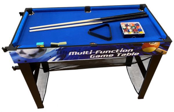 Стол объединяет 10 игр в 1: 1) Бильярд (2 кия, 2 мела, щетка, комплект шаров, треугольник для выравнивания) 2) Пинбол (2 шарика) 3) Стельба по мишеням (мишени, пистолет, пули) 4) Баскебол (кольцо с сеткой, мяч, насос) 5) Футбол (сетка, мяч, насос) 6) Стрельба из лука (лук, стрелы, мишень) 7) Настольный теннис (2 ракетки, 2 мяча, сетка) 8) Настольный хоккей (2 биты, 2 шайбы) 9) Хоккей (2 клюшки, шайба, сетка) 10) Дартс (дротики, мишень)
