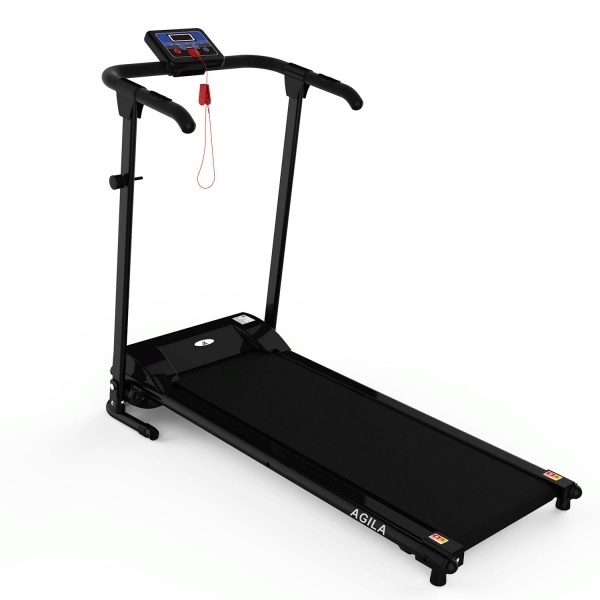 Управлять устройством можно с электронной панели на консоли. Пользователю доступен выбор одной из трех программ, также можно посмотреть пройденное расстояние, время тренировки и сожженные калории. Единственный момент – электронная система работает по встроенному алгоритму и не мониторит реальное состояние человека (нет датчиков пульса в рукоятках, нельзя подключить кардио-пояс). Регулировки угла наклона полотна также нет. Электрическая беговая дорожка Agila T99 для занятий дома. Тренажер начального уровня с мотором мощностью 1 л.с.