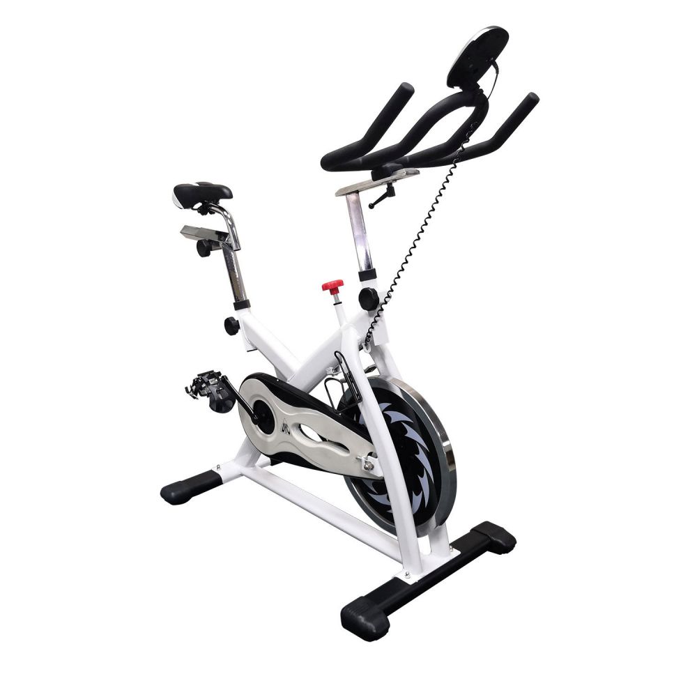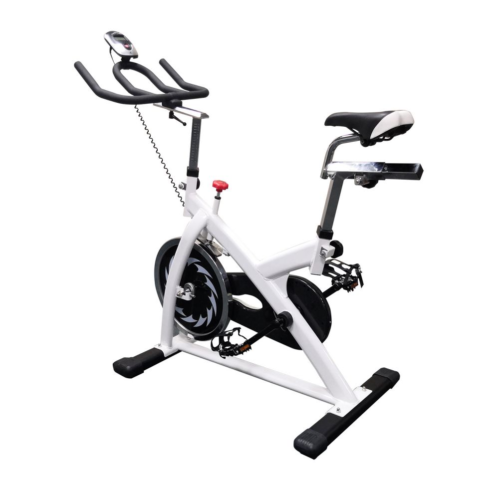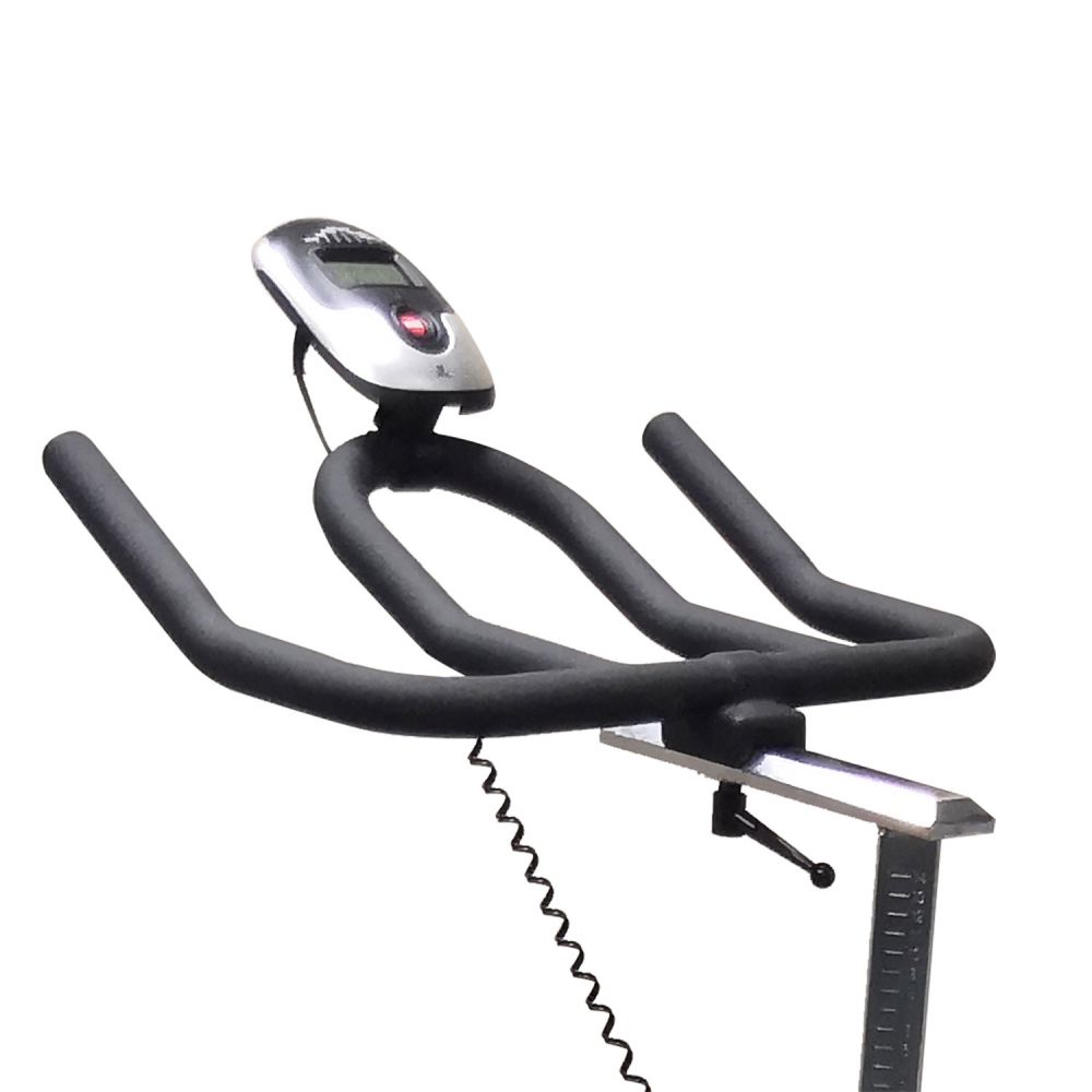 Вертикальный механический спин-байк с ременным типом привода и колодочной системой нагружения. Изменение нагрузки с помощью удобной рукоятки на корпусе тренажера. Предусмотрен экстренный тормоз. Спортивное сидение регулируется в вертикальной и горизонтальной плоскости, и позволяют подобрать удобную посадку для тренировки. Питание компьютера от батареек (тип ААА, 2 шт). На раме установлен держатель для бутылки. Для перемещения тренажера в помещении установлены колеса. Фиксация ног в педалях с помощью резиновых ремней с регулировкой.