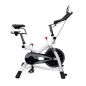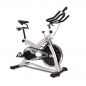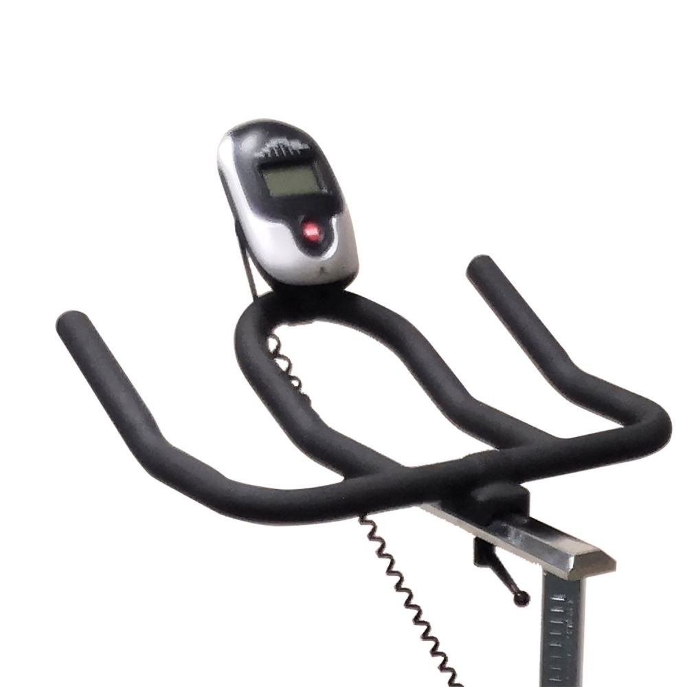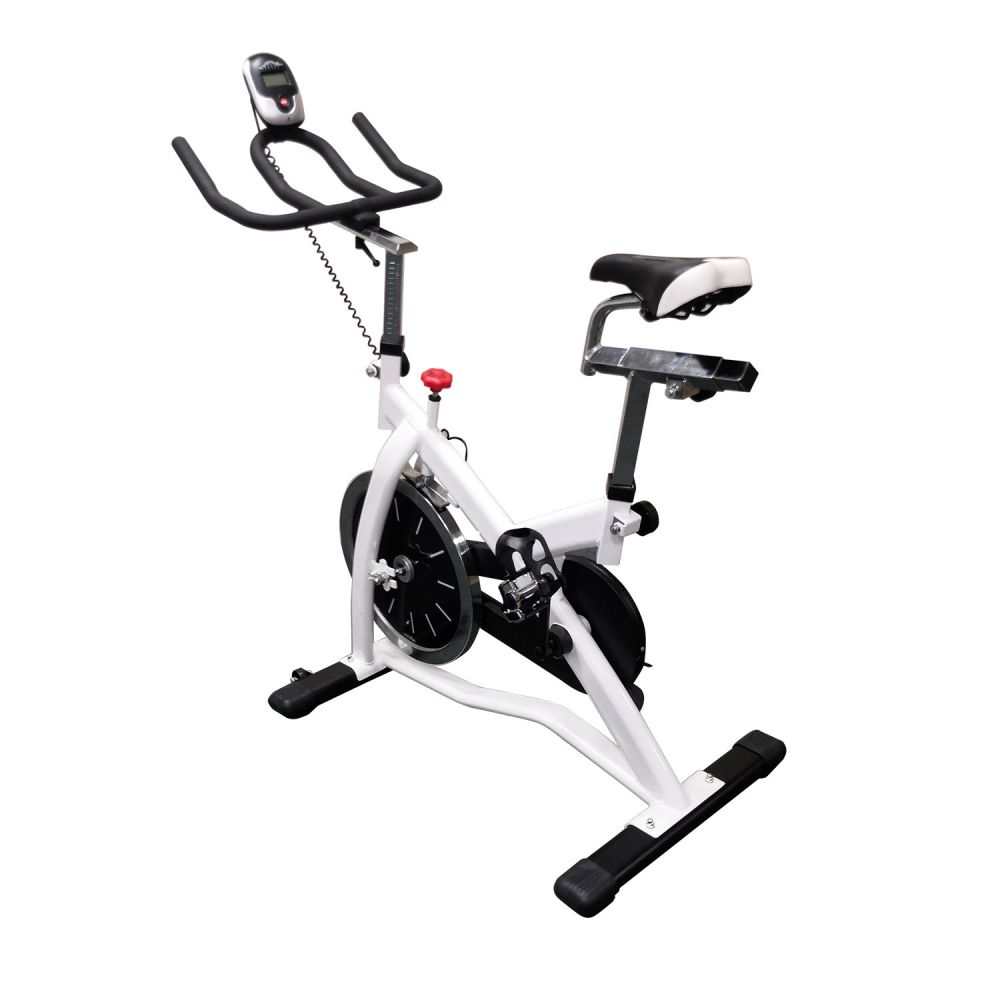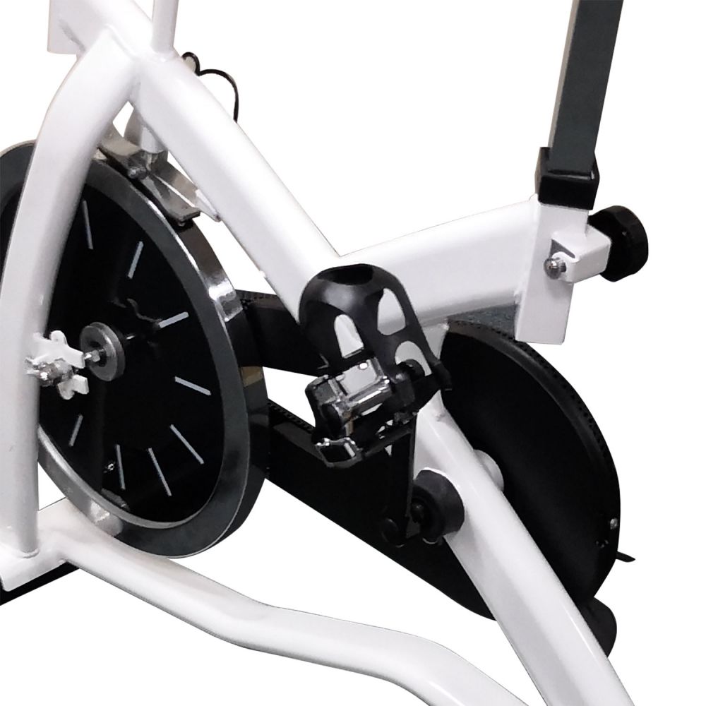 Вертикальный механический спин-байк с ременным типом привода и колодочной системой нагружения. Изменение нагрузки с помощью удобной рукоятки на корпусе тренажера. Предусмотрен экстренный тормоз. Спортивное сидение регулируется в вертикальной и горизонтальной плоскости, и позволяют подобрать удобную посадку для тренировки. Питание компьютера от батареек (тип ААА, 2 шт). На раме установлен держатель для бутылки. Для перемещения тренажера в помещении установлены колеса. Фиксация ног в педалях с помощью резиновых ремней с регулировкой.
