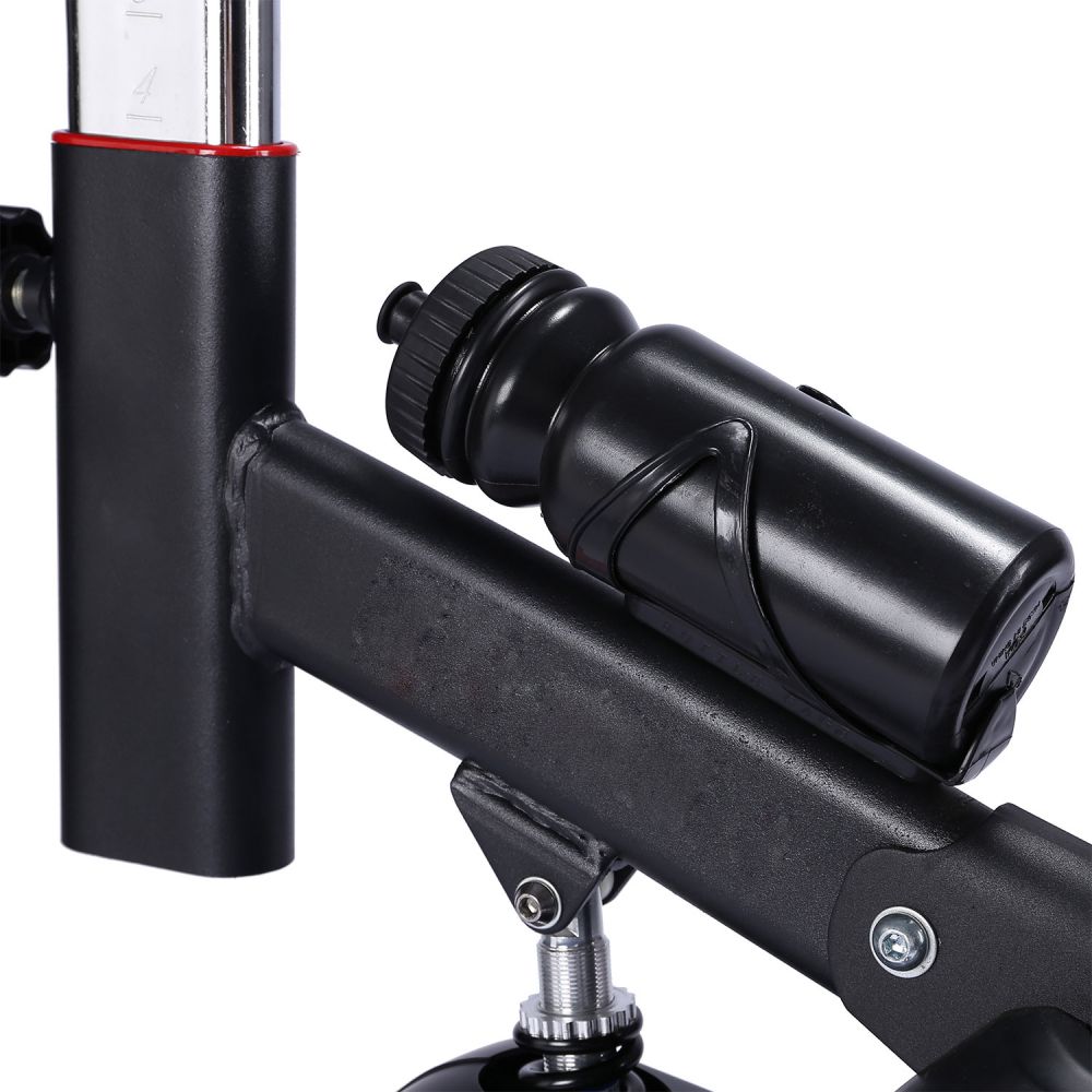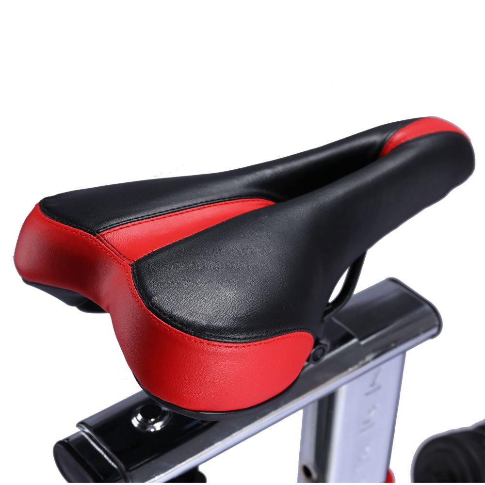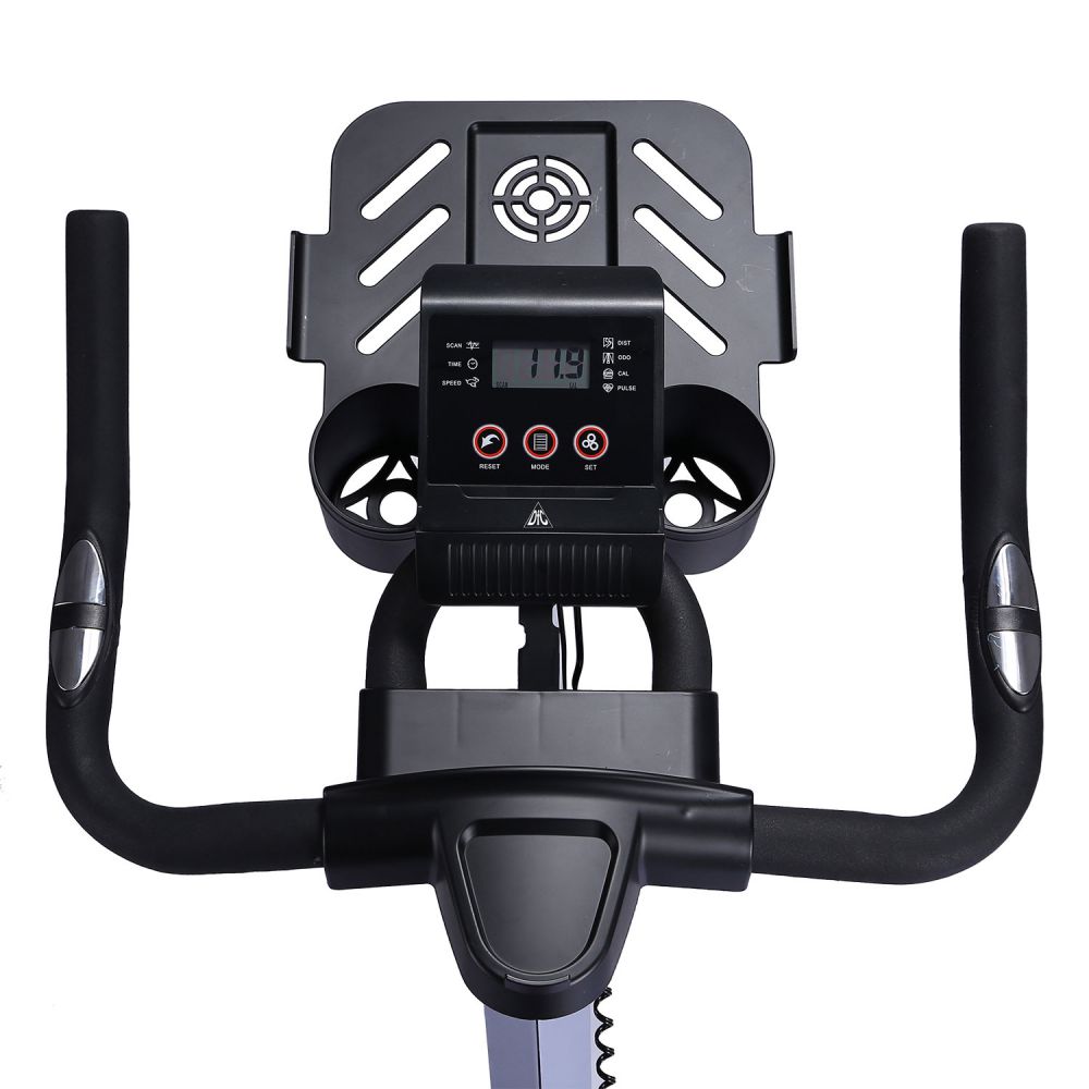 Вертикальный механический спин-байк с ременным типом привода и колодочной системой нагружения. Изменение нагрузки с помощью удобной рукоятки на корпусе тренажера, с экстренным тормозом. Спортивное сидение регулируется в вертикальной и горизонтальной плоскости, и позволяют подобрать удобную посадку для тренировки. В комплекте пластиковая бутылка для воды с держателем на раме тренажера. Для контроля пульса во время тренировки на руле есть встроенные датчики с отображением информации на дисплее компьютера. Питание компьютера от батареек (тип ААА, 2 шт).