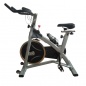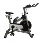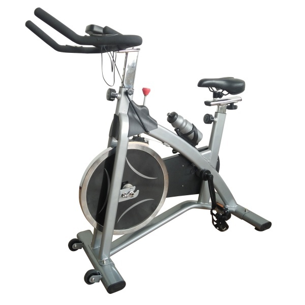 Вертикальный механический спин-байк с ременным типом привода и колодочной системой нагружения. Изменение нагрузки с помощью рукоятки на корпусе тренажера.