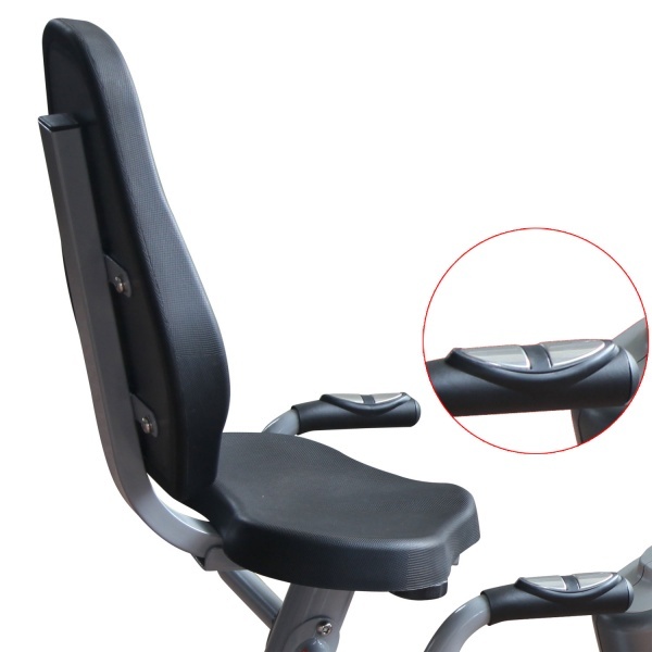 Велотренажер с удобной горизонтальной посадкой и магнитной системой нагружения. Датчики измерения пульса расположены на рукоятках и позволяют контролировать частоту сердечного ритма во время движения.