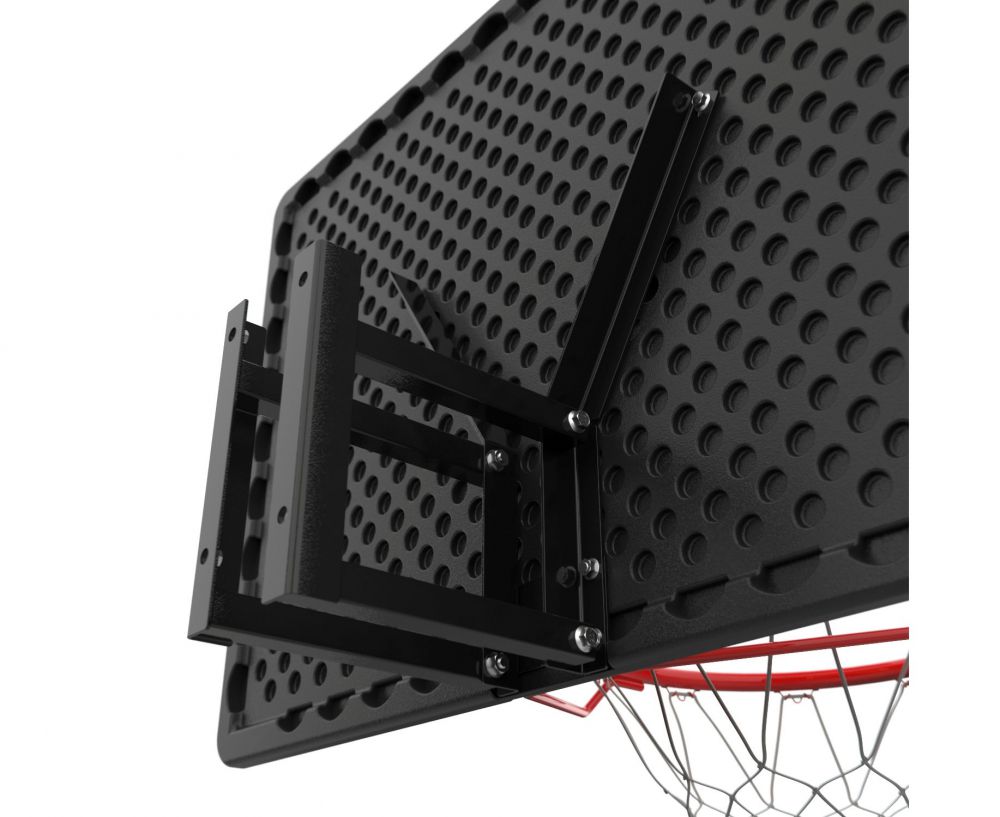 Щит сделан из полиэтилена, его размеры - 110 x 70 см и толщина 3 см. Вынос щита 85 см вместе с кольцом. Расстояние от креплений, до щита - 27 см, расстояние между креплениями щита составляет 7 см, а их длина - 29 см.