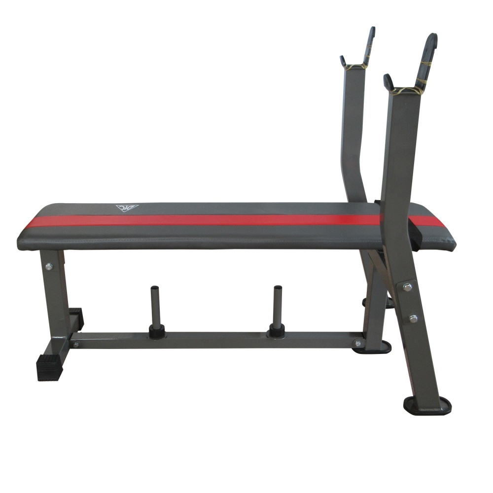 Тренажер предназначен для домашнего использования. Силовая скамья со стойками под штангу. Не регулируется по высоте. Ударопрочное эмалевое покрытие. Штанга и веса в комплект не входят. Имеются держатели для хранения дисков.