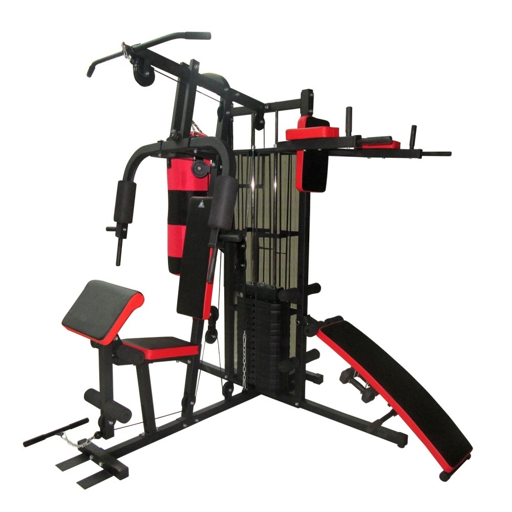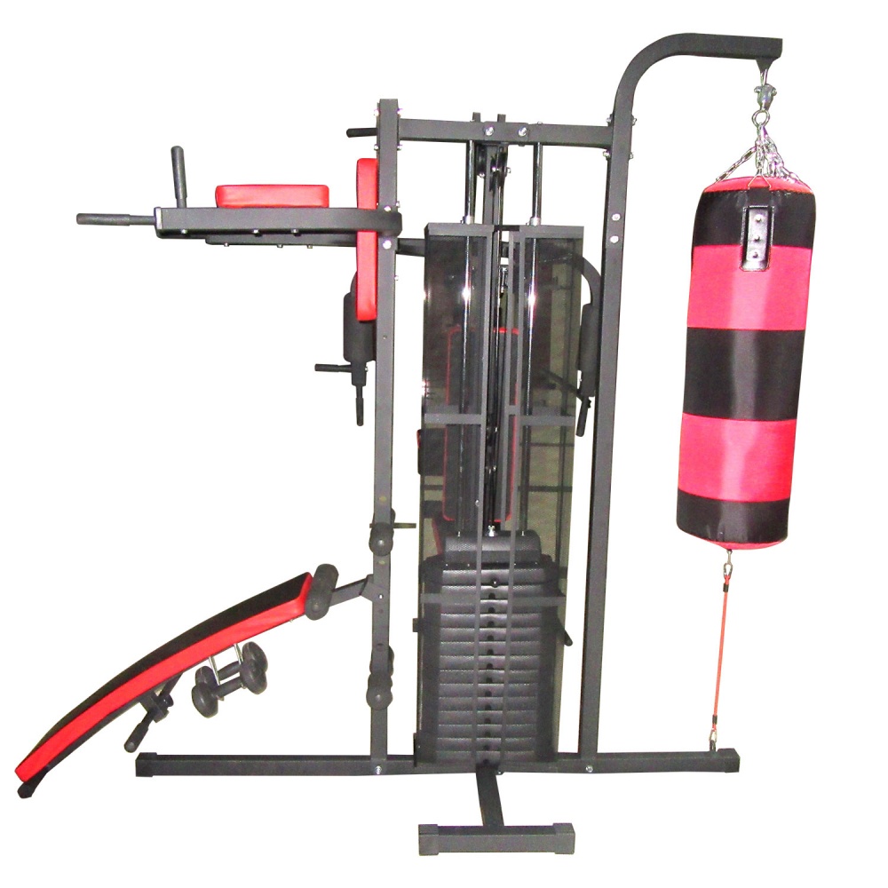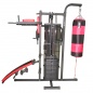Многофункциональный силовой тренажер (мультистанция) с встроенным весовым стеком 68 кг. Позволяет выполнять комплекс упражнений на различные группы мышц. Дополнительно тренажер имеет брусья для отжимания, скамью для пресса с гантелями по 1.5 кг с регулировкой по углу наклона, боксерский мешок.