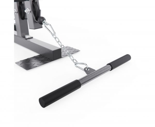 Многофункциональный силовой комплекс позволяет выполнять упражнения на грудь, спину, плечи, руки, пресс и ноги. В оснащение входят парта для бицепса, верхняя и нижняя тяга, а также тренажер «бабочка», что значительно расширяет возможности тренировок. Нижний валик предназначен для фиксации ног и выполнения упражнений на разгибание и сгибание, а также обеспечивает устойчивое положение тела при работе с верхней тягой.