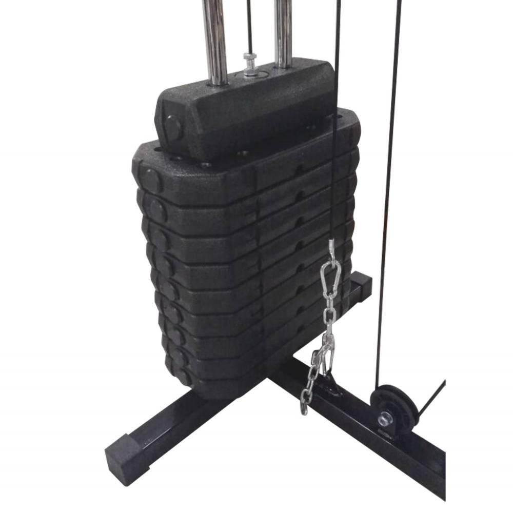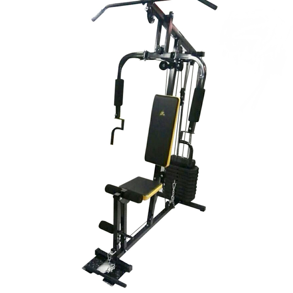 Силовой комплекс позволяет выполнять упражнения на различные группы мышц - жим от груди, баттерфляй, верхняя и нижняя тяги, пресс - спина, разгибание ног. В комплекте весовой стек массой 45 кг - 9 пластин по 4,5 кг и верхняя пластина 5 кг.
