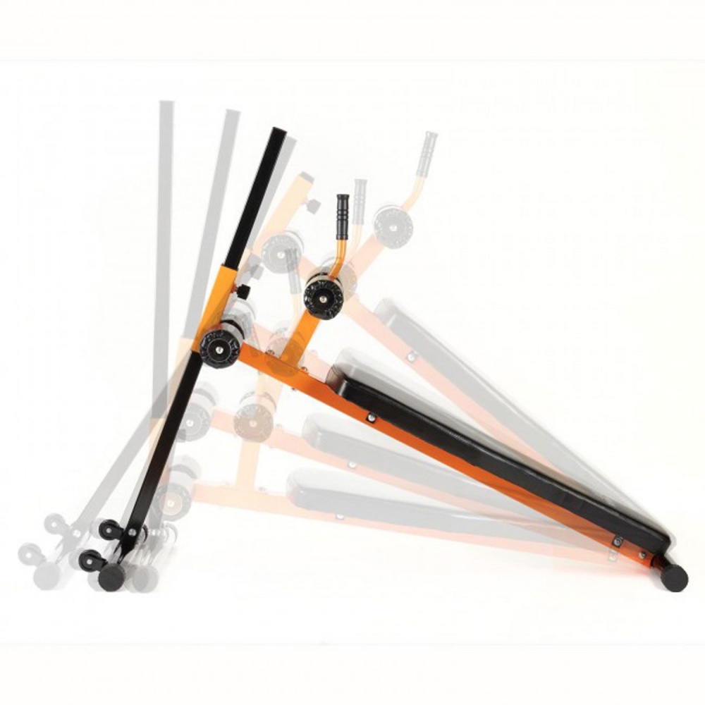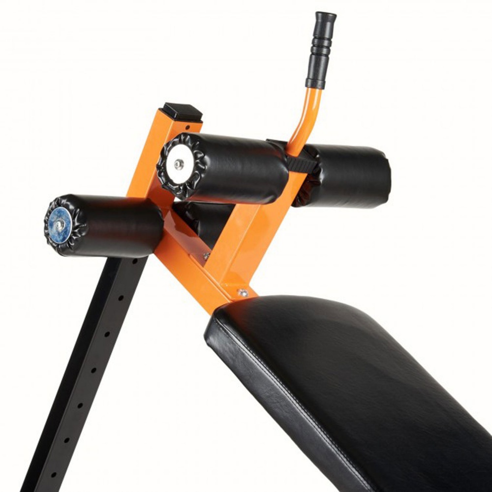 Рама изготовлена из высококачественного стального профиля. Порошковая покраска в черно - оранжевый цвет. Обивка скамьи из прочного кожзама и мягкой вставкой для комфортных занятий.