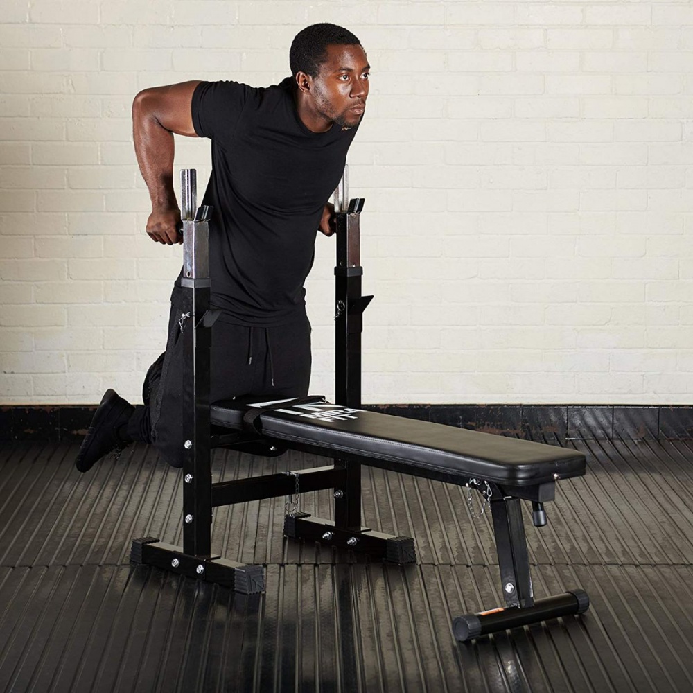Скамья силовая со стойками под штангу DBCH2W предназначена для выполнения таких упражнений, как жим штанги лежа, отжимания на брусьях и другие. Складная конструкция позволит сложить скамью после занятий. Тренажер занимает совсем мало места.