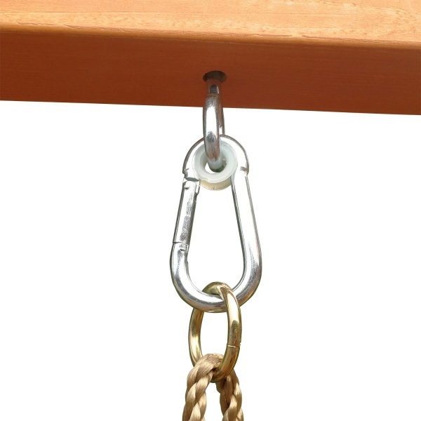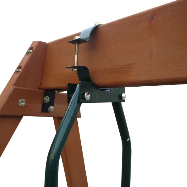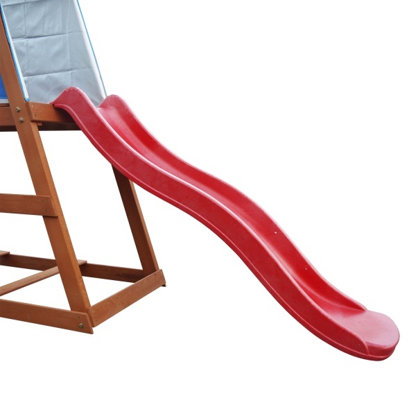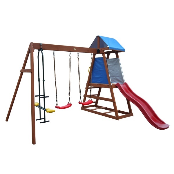 Горка с волной снабжена боковыми бортиками, обеспечивающими безопасность малышей. Дополнительными элементами для развлечений служат различные качели - двойные и одиночные. Качели имеют надежное подвесное крепление на боковой части комплекса.