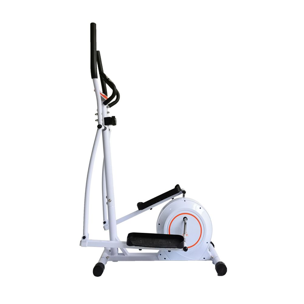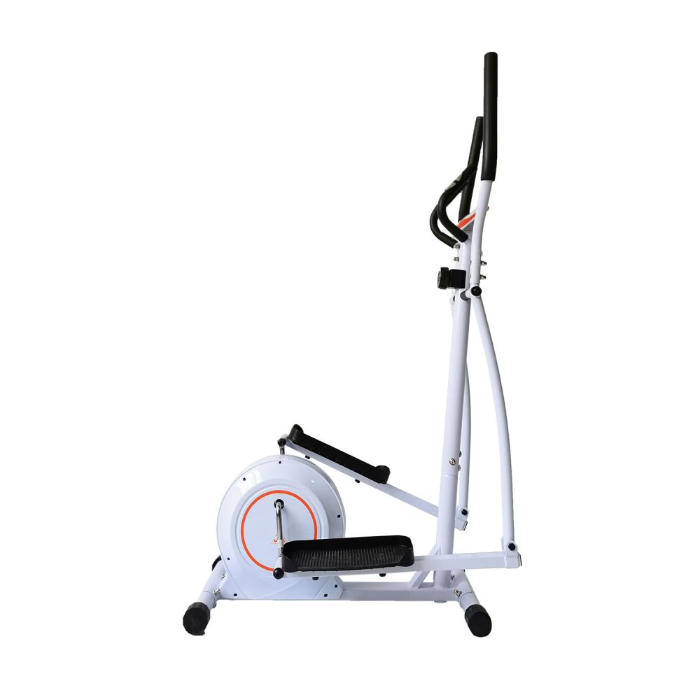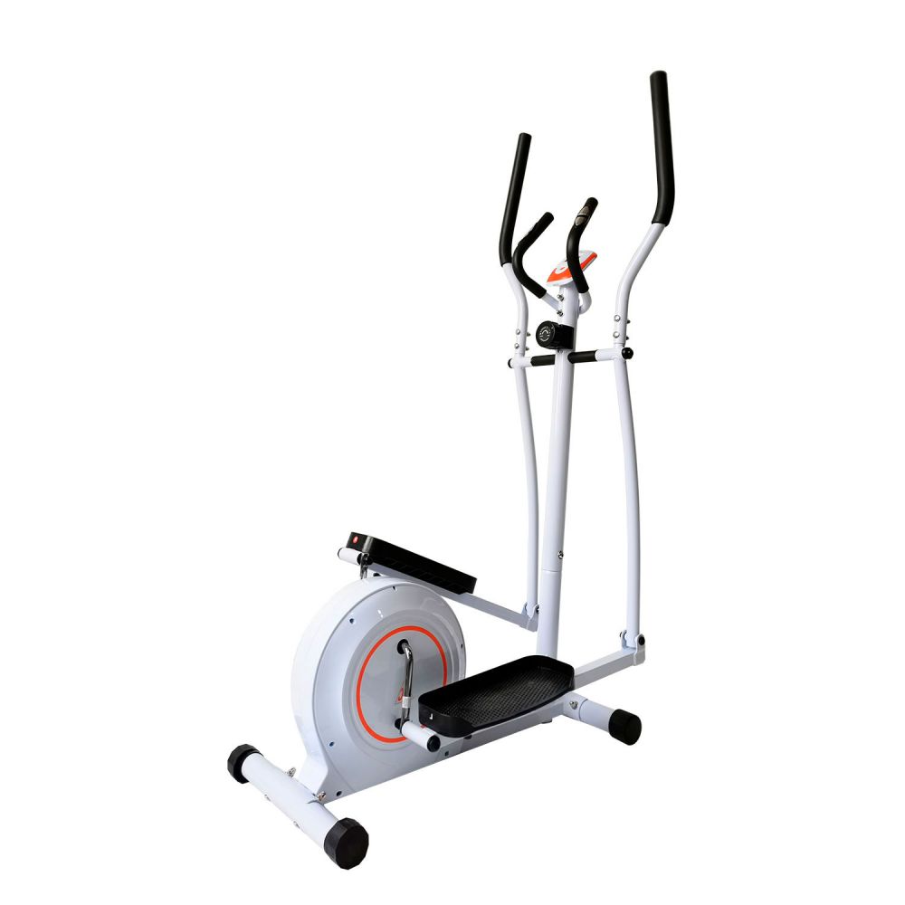 Эллиптический тренажер для домашнего использования. Модель с высокоскоростным маховиком и магнитной системой нагружения. Механическая (ручная) регулировка изменения нагрузки с помощью рукоятки на стойке тренажера. 8 промежуточных положений. Консоль с LCD-экраном компьютера отображает все необходимые параметры тренировки: время, скорость, дистанция, калории, скан, пульс. Датчики пульса расположены на дополнительных рукоятках тренажера. Большие педали с нескользящим покрытием и бортиком по краям.