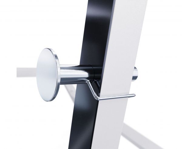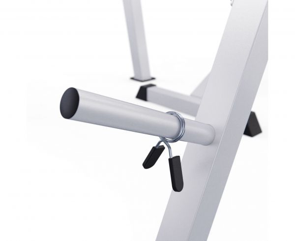 Скамья для жима имеет посадочное место для хранения дисков 25 мм. Длина посадочного места равна 20 см, а в комплекте идут 2 пружинных замка.