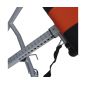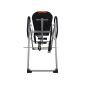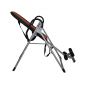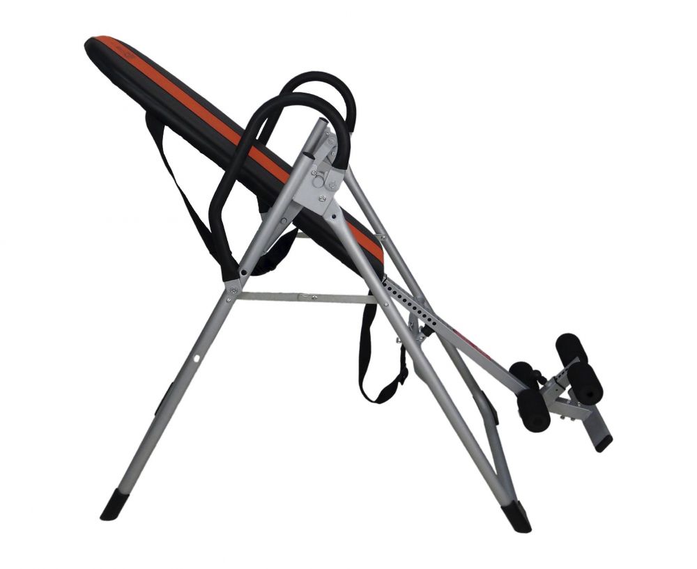 Инверсионный стол складной для домашнего использования с удобной мягкой спинкой. Цвет спинки чёрный с яркой оранжевой вставкой. Фиксатором для ног являются мягкие валики, регулируемые по длине.