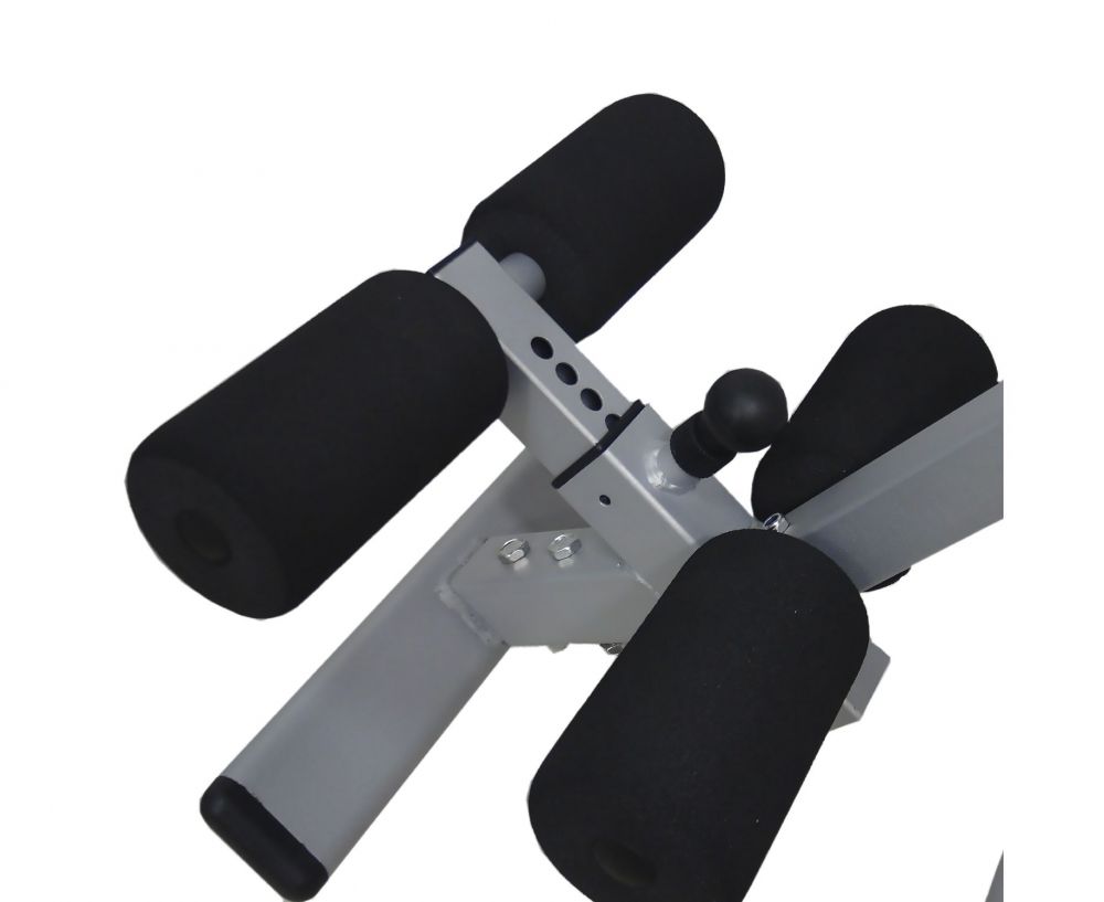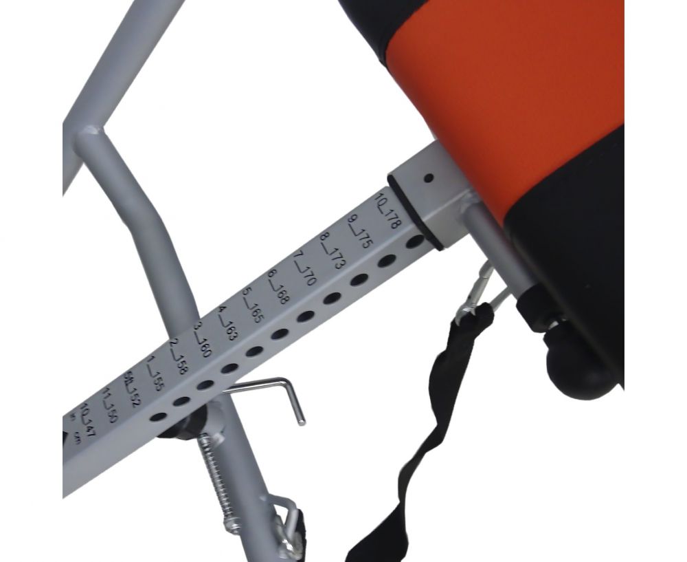 Стол позволяет зафиксировать нужный угол наклона с помощью ремня и перекладины. До начала занятия наклоните стол до нужного уровня и подтяните ремень. Если снять ограничительную перекладину, то возможно отклонится в вертикальное положение (головой в пол). Стол имеет регулировку под рост пользователя в диапазоне от 147 до 198 см.