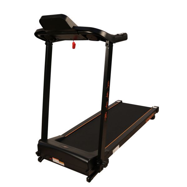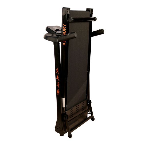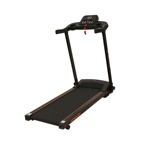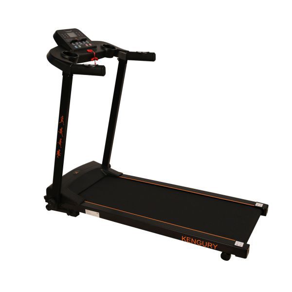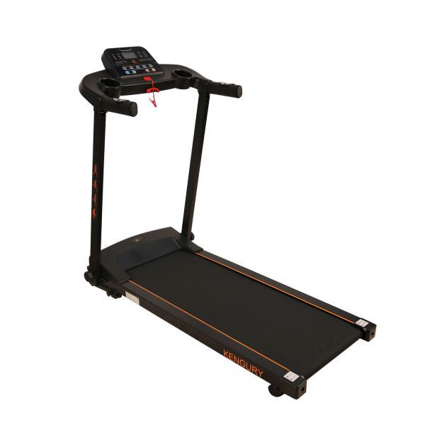 Панель управления оснащена дисплеем, на котором будут отображаться различные данные, включая частоту пульса. Показатели снимаются с сенсоров на ручках, но для более точного мониторинга состояния здоровья необходимо дополнительно приобретать кардио-пояс. К недостаткам тренажера стоит отнести отсутствие системы изменения угла наклона бегового полотна, а также максимальный вес пользователя не более 100 кг. Дорожка Kengury T122B (черно/оранжевая) предназначена для индивидуальных тренировок в домашних условиях. На стойках тренажера присутствует изображение бегущих людей.