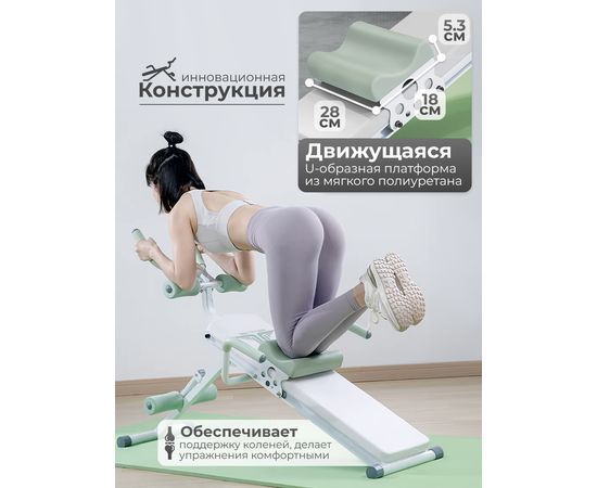Скамья оснащена просторной U-образной подвижной платформой (28 х 18 х 5,3 см) с двойными направляющими и эргономичной подушкой для коленей, которая обеспечивает устойчивость и комфорт во время занятий. Высота регулируется на 3 уровня, что позволяет адаптировать сложность тренировки под уровень подготовки пользователя — от новичка до опытного спортсмена.
