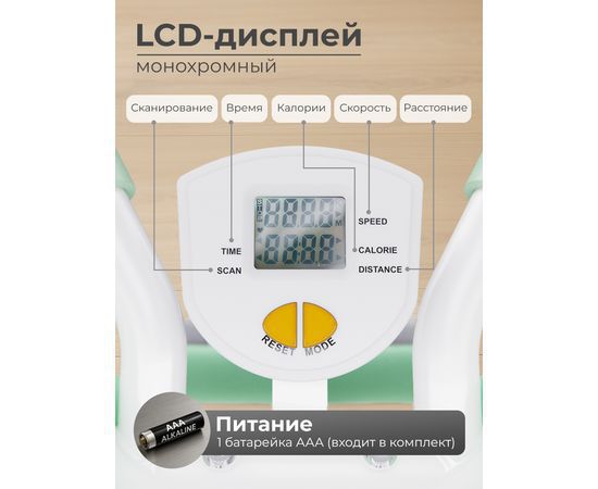 Для отслеживания результатов тренировок скамья оборудована встроенным монохромным LCD-дисплеем. Он отображает ключевые параметры: время тренировки, количество повторений, количество сожжённых калорий и частоту движений в минуту. Питание от 1 батарейки AAA (входит в комплект).