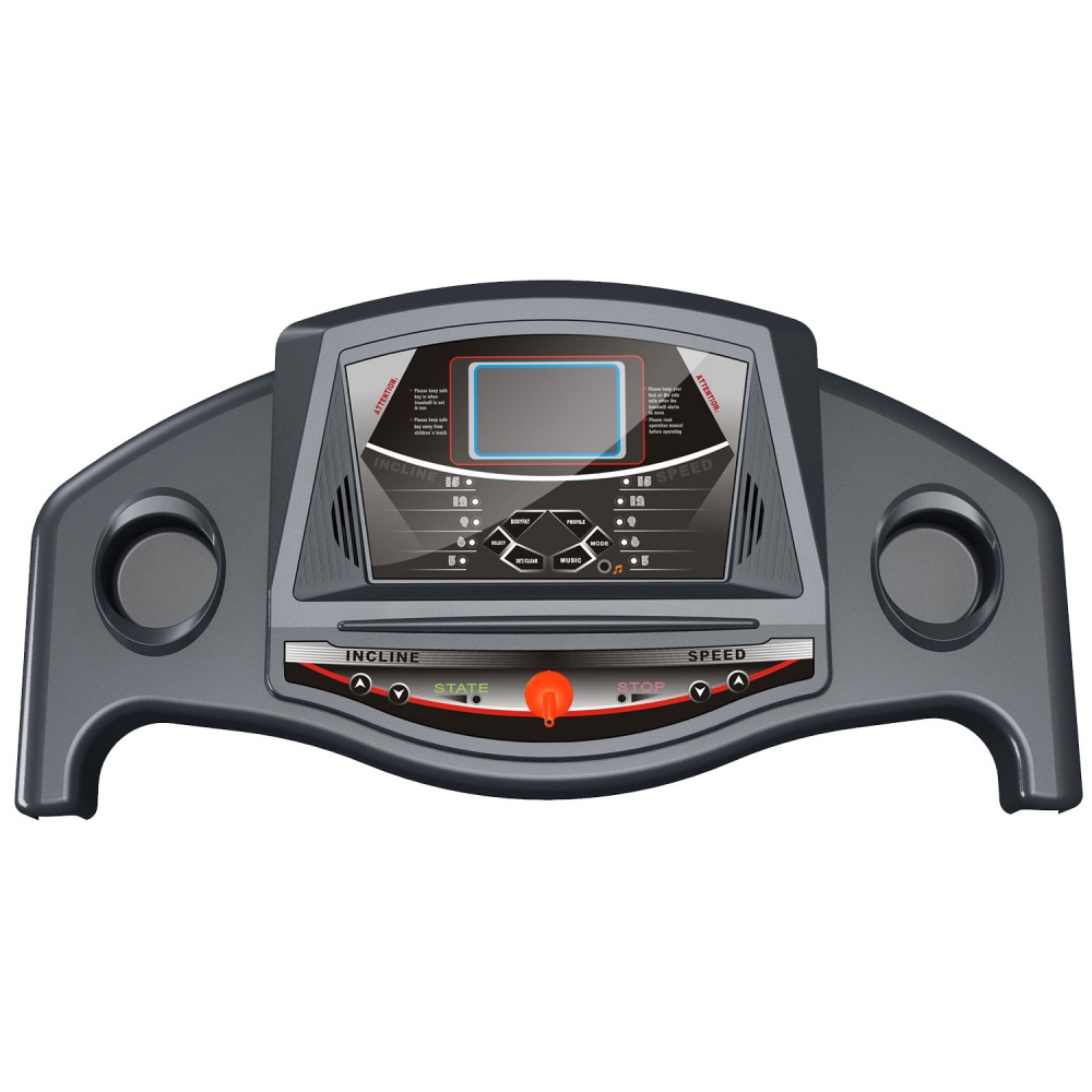 Преимуществом при выборе данной модели тренажера будет применение в ней электрического изменения угла наклона бегового полотна. Панель управления с LCD-экраном и 2-мя карманами по краям для размещения бутылки с водой и различных предметов. Кнопки изменения скорости и угла наклона бегового полотна, датчики пульса на поручнях. Вход для MP3-плеера с 2-мя встроенными динамиками.