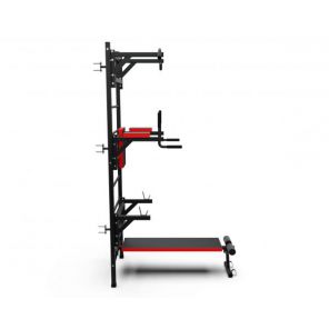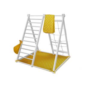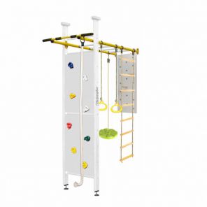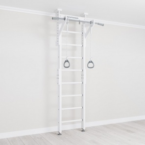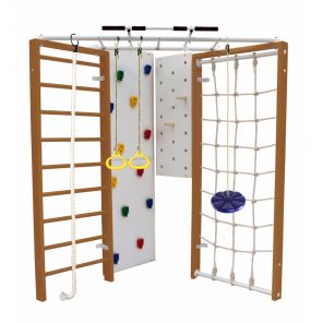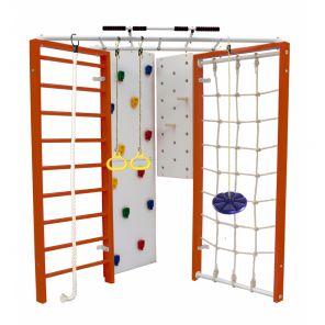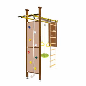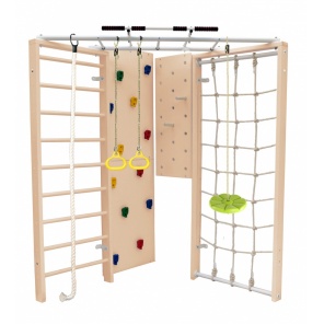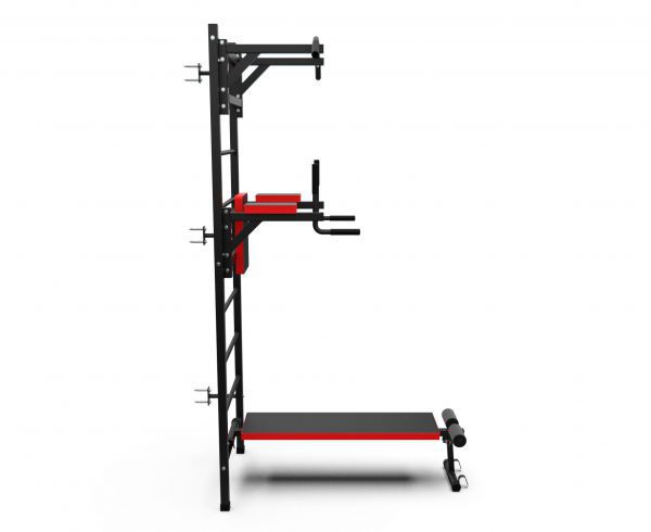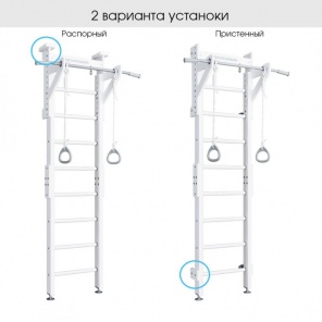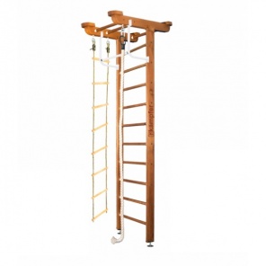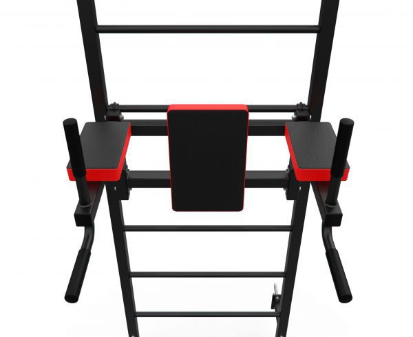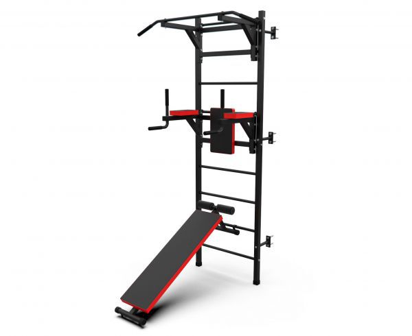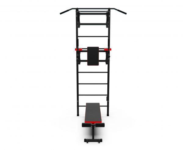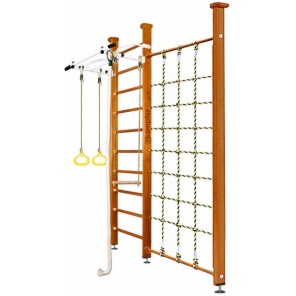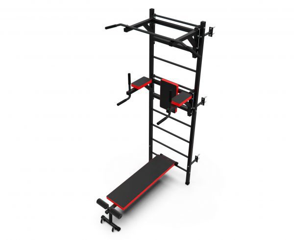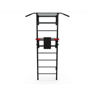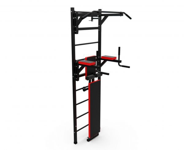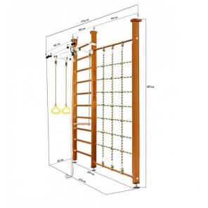 Турник длиной 99 см оснащён мягкими неопреновыми ручками, очень легко перевешивается на перекладины шведской стенки, что позволяет менять его высоту. Расстояние от ручек турника до шведской стенки (вынос турника) - 72 см. Вынос брусьев – 87 см, размер подушки под спину 42 х 25 см, а её толщина 5 см. Подушки подлокотников размерами 25 х 13 х 5 см, а поручни длиной 32 см диаметром 25 мм и толщиной стали 1,5 мм.