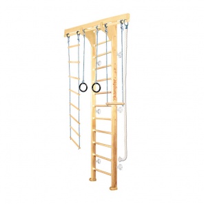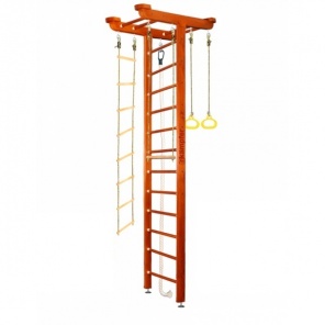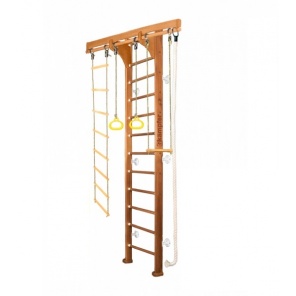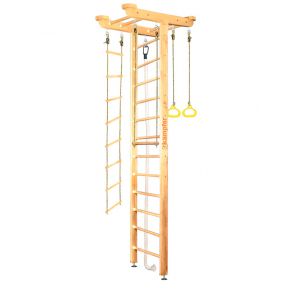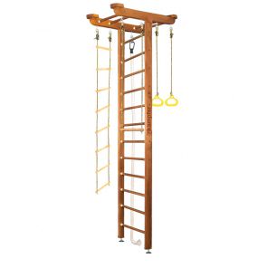 Сама стенка компактная: её высота составляет 231 см, а ширина всего 70 см. Расстояние от стены до стоек шведской стенки - 16 см. Расстояние между стойками диаметром 50 мм и толщиной 1,2 мм составляет 60,5 см, что является и шириной девяти перекладин диаметром 25 мм.