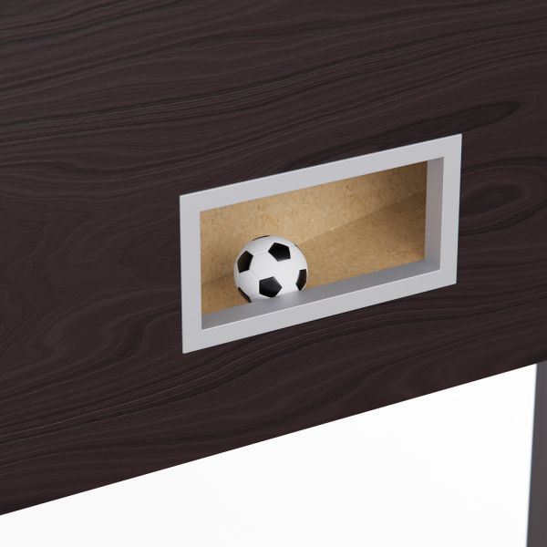 Корпус стола выполнен из МДФ с покрытием ПВХ, что придаёт конструкции прочность, устойчивость и долговечность. Гладкая поверхность игрового поля обеспечивает равномерное скольжение мяча и сохраняет динамичный темп игры. Толщина игрового поля — 9 мм, а толщина бортиков — 12 мм, что способствует хорошему контролю мяча и динамичной игре.