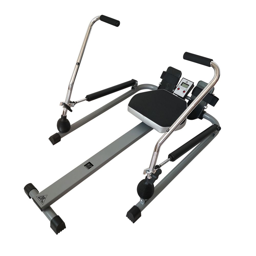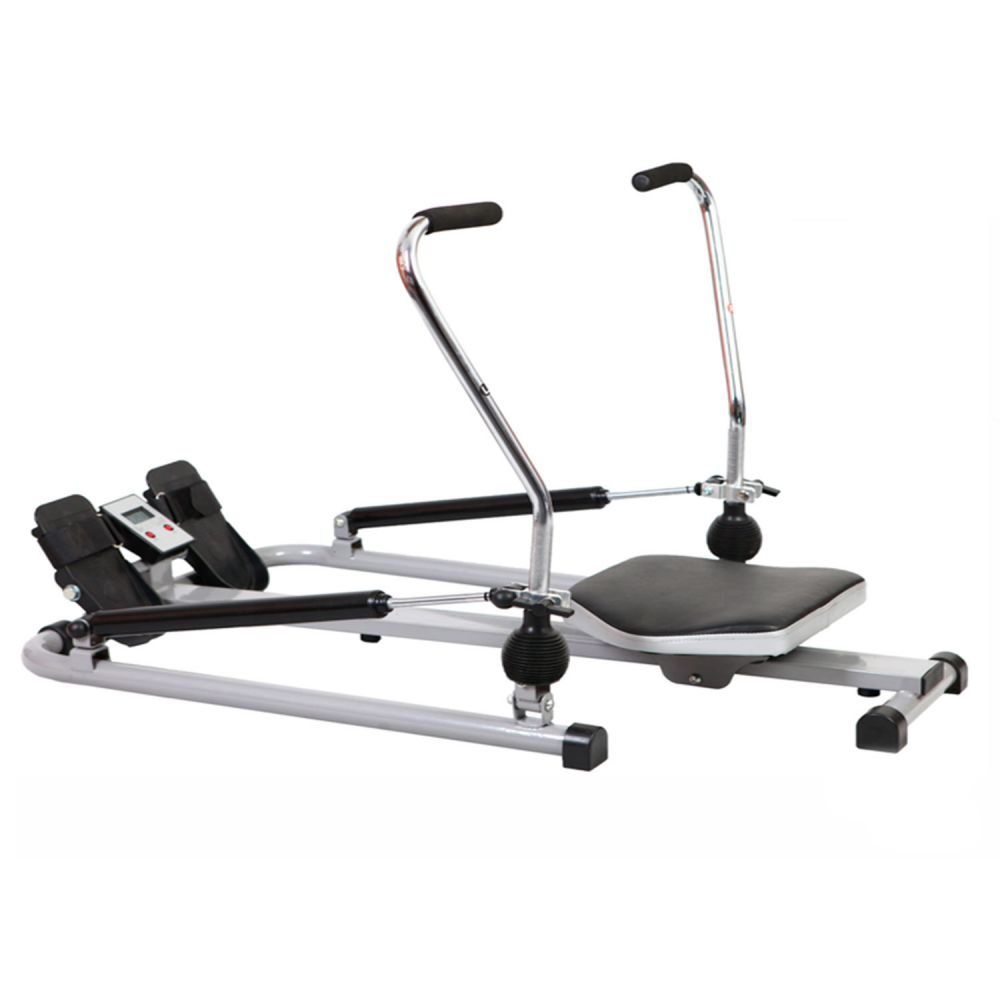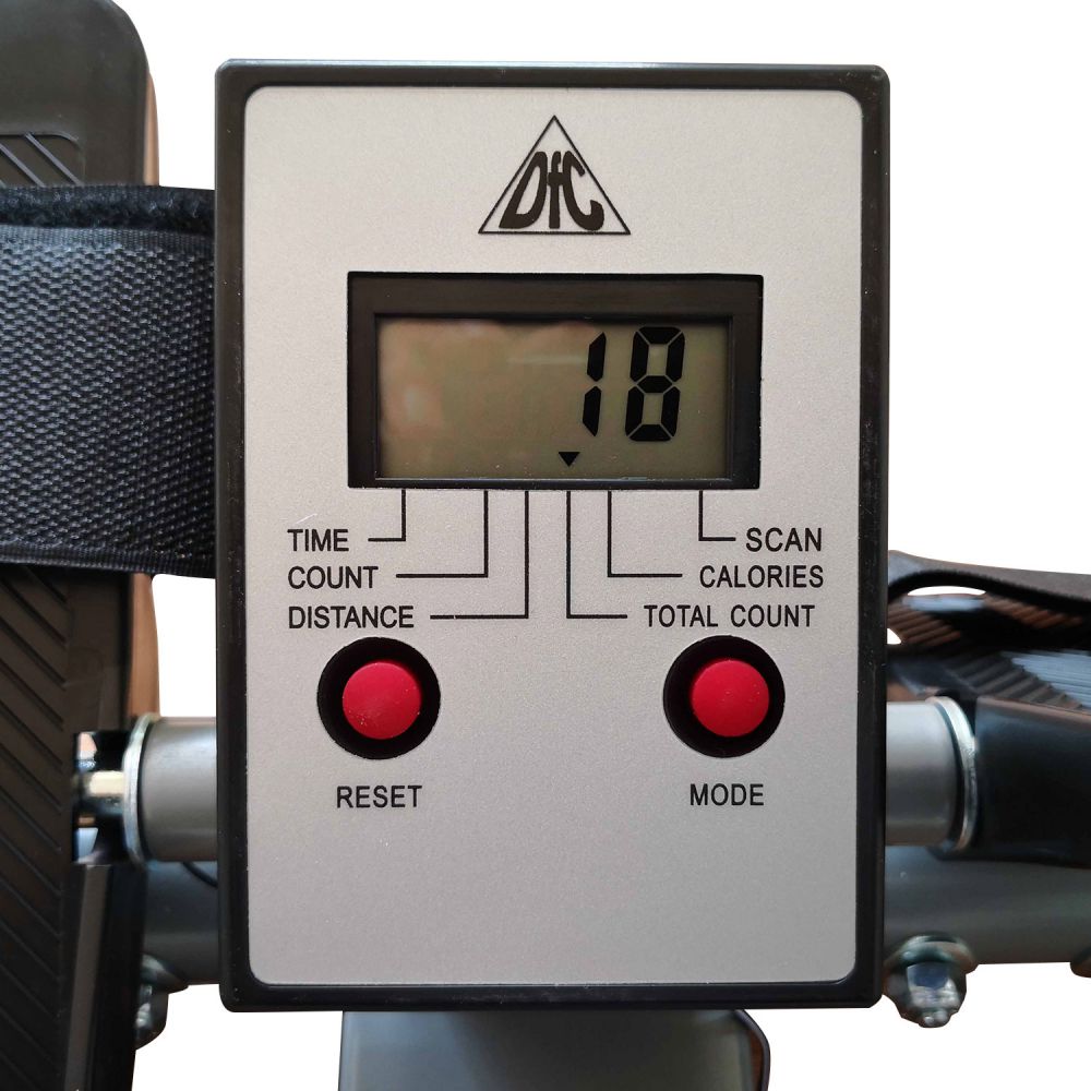 Гребной тренажер DFC R403B3 предназначен для домашнего использования. Консоль с LCD-экраном компьютера отображает необходимую во время тренировки информацию - время, гребки, расстояние, скан, калории, общее количество гребков. Питание консоли от батарейки. Диапазон вращения рукояток гребного тренажера составляет 360°. Система нагружения состоит из 2 гидравлических цилиндров, нагрузка не регулируется. Для удобства тренировки возможно изменить высоту крепления цилиндра к веслам (рычагам).
