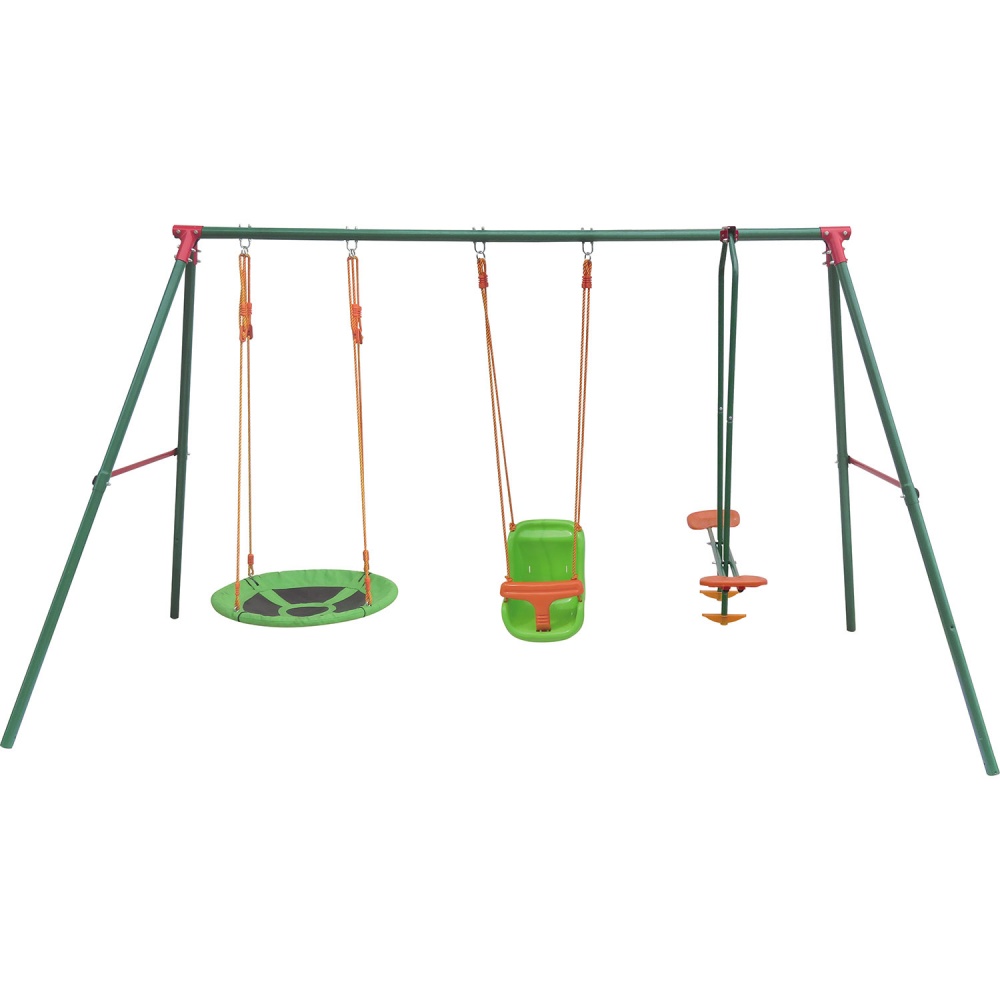 Радость от захватывающей игры детям подарит такое игровое оборудование, как уличный комплекс DFC RGN-02! Конструкция включает в себя двухместные качели, качели-гнездо и качели для детей. Преимуществами модели являются регулируемые по высоте веревки для качелей, устойчивый материал к воздействию солнечных лучей, а также спускной желоб и сидение качелей из безопасного пластика. Литая конструкция спускного желоба выступает надежной опорой для горки, поэтому родители могут не переживать за безопасность своих детей. Основа детского комплекса выполнена из металла, поэтому изделие выдерживает высокие нагрузки и не повреждается под воздействие влаги, ультрафиолета и других внешних факторов. Порошковая окраска металлических комплексов сохраняет яркость расцветок длительный период, а также обеспечивает защиту от образования коррозии, ржавчины, сколов и царапин.