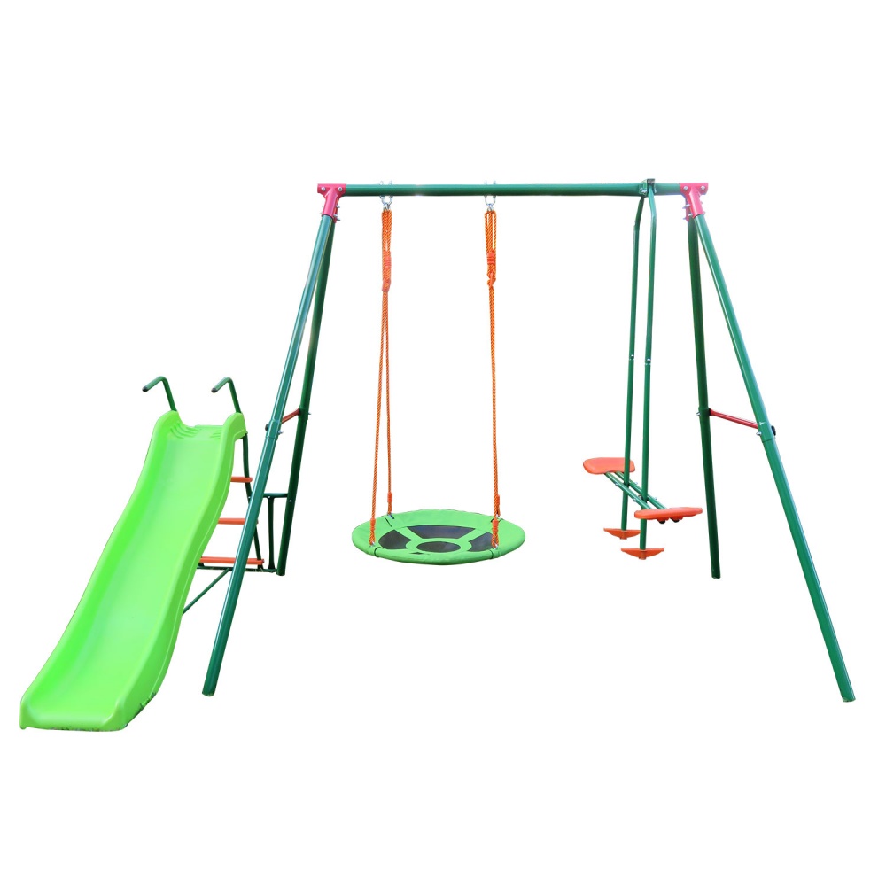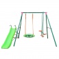 Для размещения на даче или уличной детской площадке подходит детский комплекс с горкой RGN-03 от ведущего производителя – компании DFC. Конструкция включает в себя двухместные качели, качели-гнездо и горку – отличная комплектация для детей, начиная с трехлетнего возраста! При этом, детский комплекс не занимает много места, что подойдет для небольших участков. Монтаж осуществляется методом бетонирования металлических опор конструкции. В процессе производства все металлические элементы проходят дополнительную антикоррозийную обработку, что повышает показатели прочности и устойчивости к негативным внешним факторам. Различные элементы качелей и горки выполняются из высокопрочной и стойкой к повреждениям пластмассы. Надежной опорой горки является литая конструкция спускного желоба, которая оснащена высокими бортиками для обеспечения безопасности детей и исключения рисков случайных падений на землю.