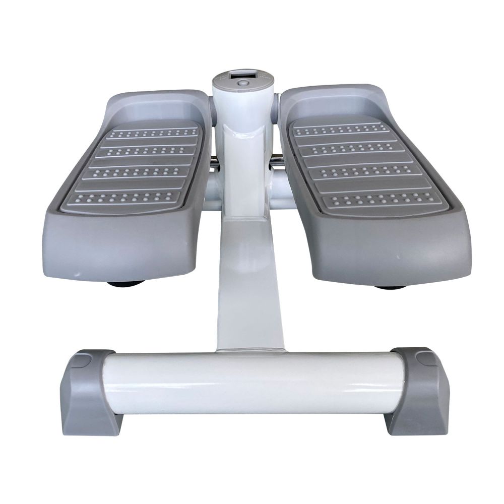 Мини-степпер прорабатывает и тонизирует ягодицы и мышцы ног. Система нагружения — 2 гидравлических цилиндра. Взаимозависимый ход педалей. Нескользящая поверхность педалей (платформ) для ног. Компьютер - время, количество шагов за тренировку, ритм (количество шагов в минуту), калории, скан. Питание компьютера от батарейки.