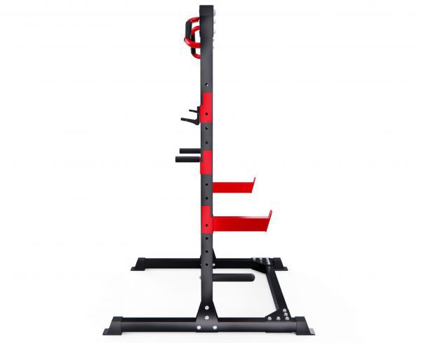 2 пары держателей для штанги регулируются на 12 уровней по высоте. Максимальная нагрузка на держатели штанги 150 кг. Для хранения дисков предусмотрены 2 держателя по углам тренажера длиной 25 см (диаметр 25 мм), а также переходная втулка (диаметр 50 мм). Максимальная нагрузка на каждый держатель для дисков 60 кг. Нескользящие ножки надежно устанавливаются на полу и не царапают поверхность.
