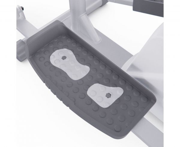 Длина шага составляет 36 см, а расстояние между педалями — 20 см, что обеспечивает комфорт и безопасность во время занятий. Транспортировочные ролики и компенсаторы неровности пола делают тренажёр мобильным и устойчивым.