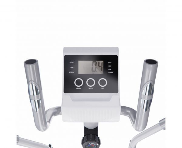 Консоль тренажёра оснащена монохромным LCD-дисплеем, который показывает скан, время, расстояние, калории, скорость, пульс и общую дистанцию. Сенсорные датчики на поручнях позволяют контролировать пульс во время тренировки. Консоль работает от двух батареек типа AA, которые не входят в комплект поставки. Эллипсоид – это отличный способ вести здоровый образ жизни. Эллипс помогает вести активный образ жизни всем членам семьи.